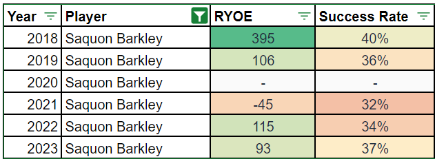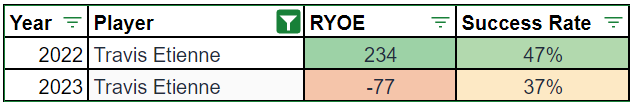 But as part of last year's improved production, Etienne's rushing efficiency cratered. He flashed very exciting potential in 2022, but last season was a legit red flag.