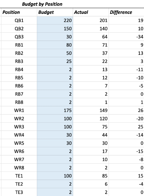 Again, you can be flexible here and change course throughout the draft, but having a baseline will make the process that much smoother. I am constantly monitoring and adjusting if I spend less or more than I planned at a position. I will move that money around to account for these changes. If I identify a position where I think there is extraordinary value or people are over spending, I will adjust accordingly as well.