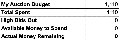 Here is an example of a budget tracker I used for the auction and summary. I also tracked the amount of money I spent to know the actual total amount remaining and how much usable funds I have at any given time. Remember, money is tied up in your maximum bids until that player clears the 12-hour clock.