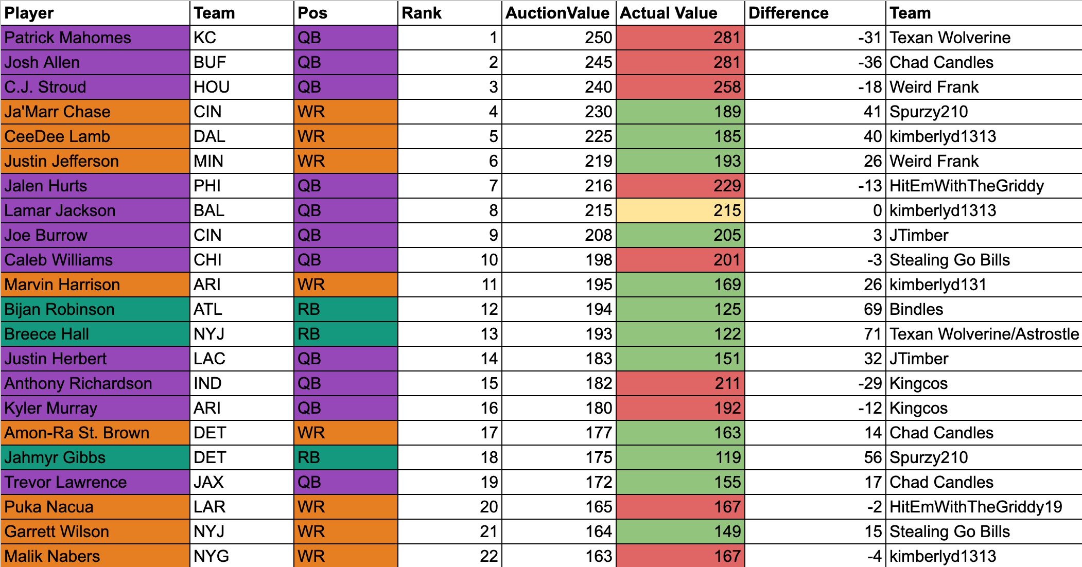 Some of the best running back steals during this time were my win of Jonathan Taylor, Bindles with Bijan Robinson, Texan Wolverine/Atostle with Breece Hall, Spurzy210 with Jahmyr Gibbs, Keith with Christian McCaffrey and Saquon Barkley, and JTimber with James Cook.