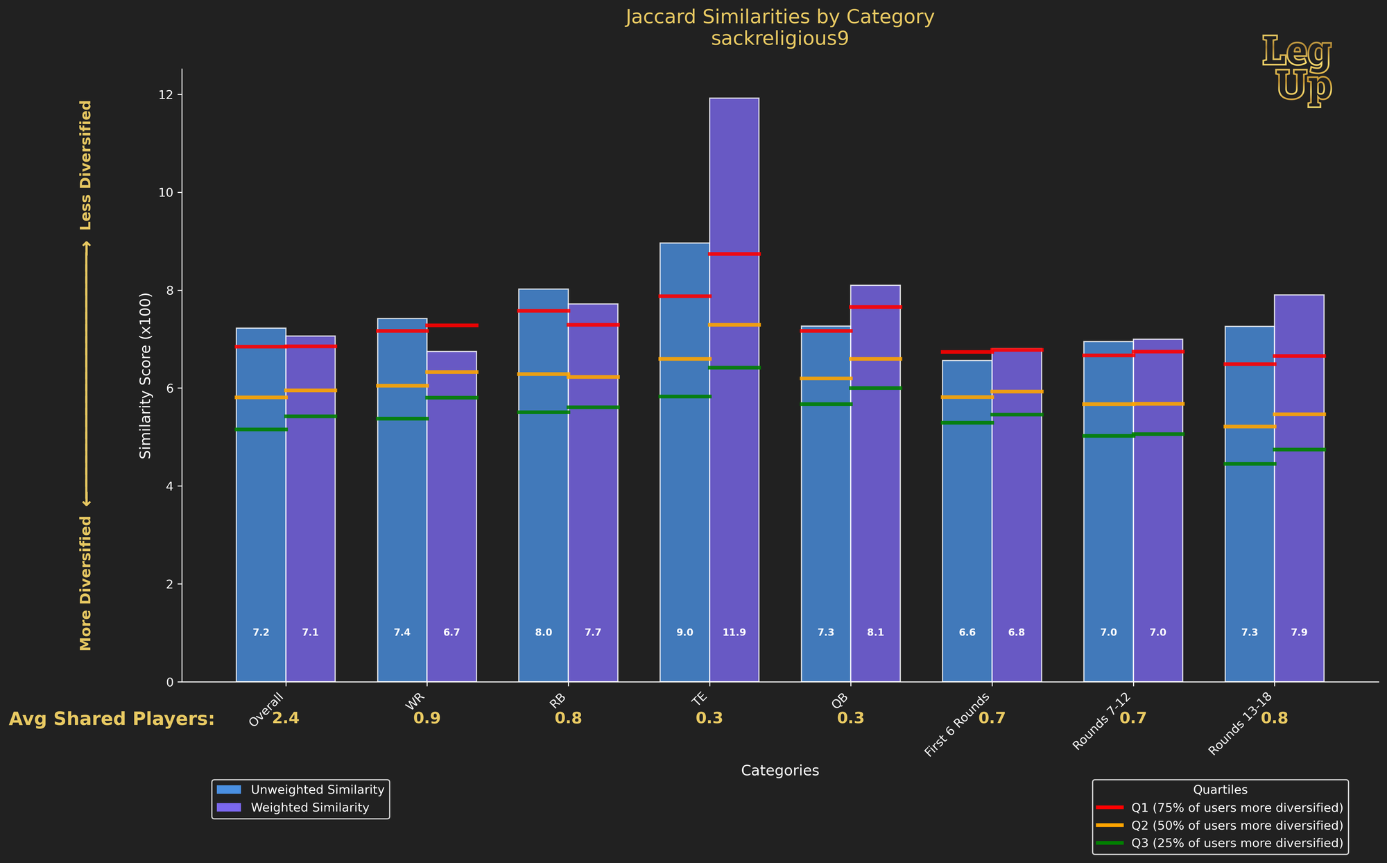 The chart below has two bars for each category: an unweighted and a weighted Jaccard Similarity Score.
