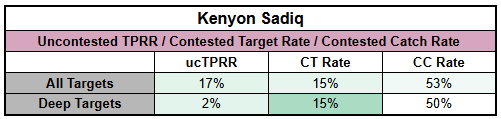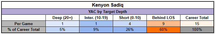 Part of the issue is that Sadiq really only shone as a YAC producer on schemed targets. Those targets accounted for a quarter of his overall production, which is already a bit of a red flag. But his YAC profile looks almost entirely manufactured.