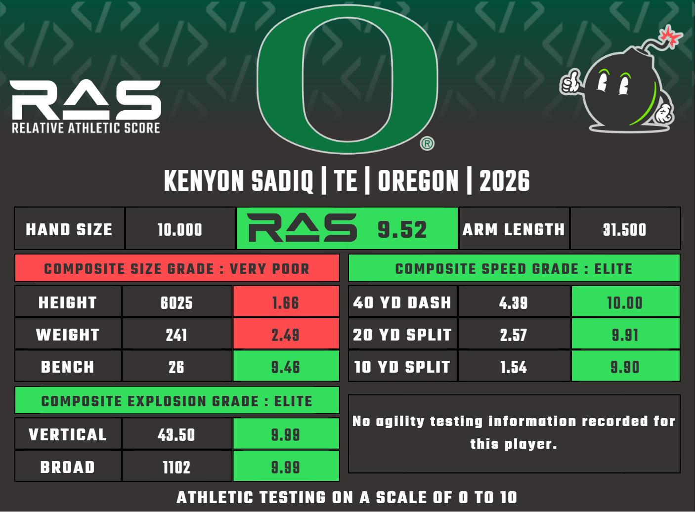 Kenyon Sadiq, first and foremost, is an elite athlete. That's true after adjusting for his size. But it's also true even if you don't. Regardless of a player's height and weight, a 4.39 40 with a 1.54 10-yard split is awesome; as is a 43.5-inch vertical; as is a 134-inch broad jump. In a vacuum, Sadiq is incredibly athletic—even before you get to the fact that he weighed in at 6-foot-3, 241 pounds.