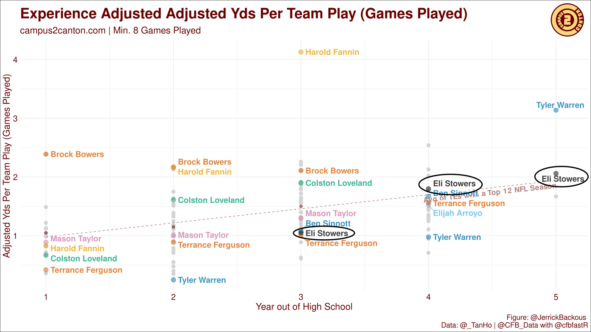 Eli Stowers, a converted QB, emerged in 2024 at Vanderbilt with a 27% yardage yardage share and a 26% dominator rating. The following year, he maintained strong yardage production with a 23% yardage share.