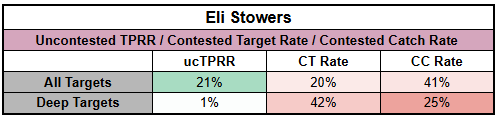Stowers didn't switch to tight end until his third season from high school. And in that season—his final year at New Mexico State—he wasn't productive. In that 2023 year, he turned in just a 13% yardage share, 11% dominator rating, 1.02 YPTA, and 1.89 YPRR.