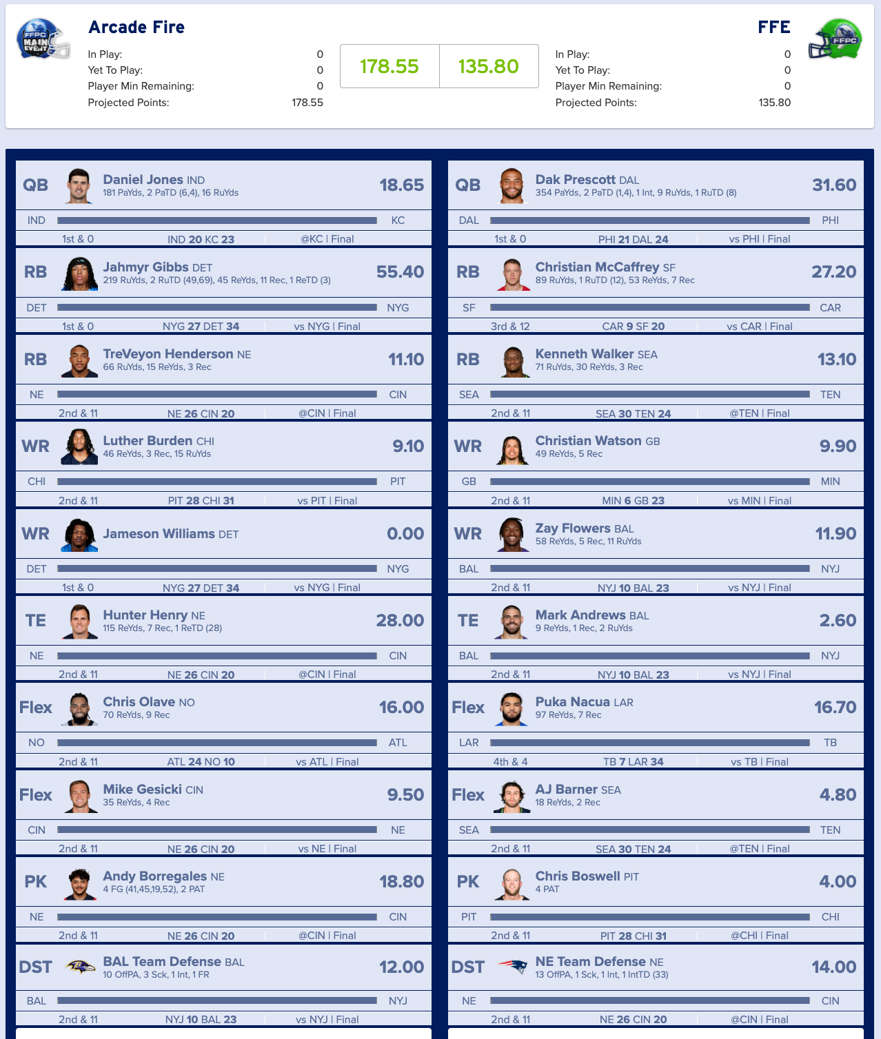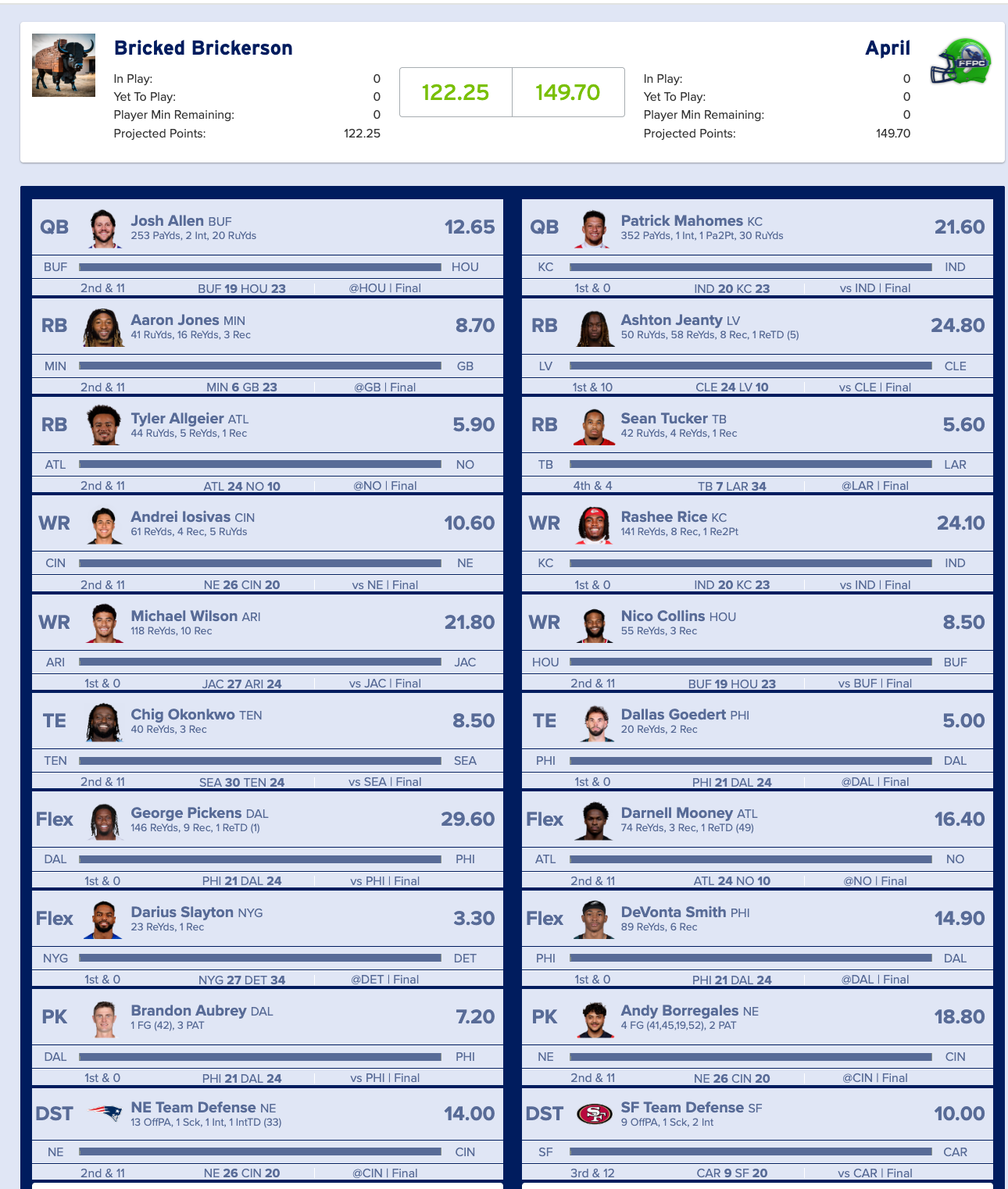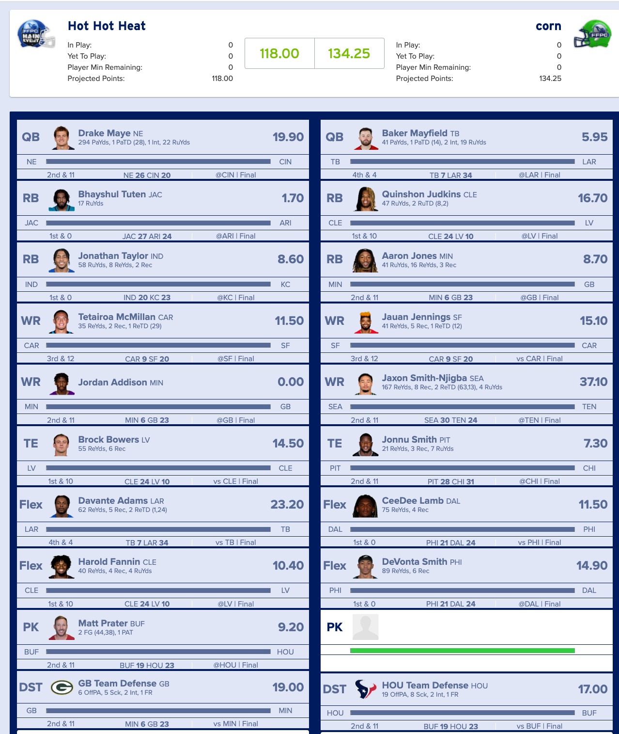 My team had one of its worst performances of the season, and had a huge sweat heading into Monday night. My team remained well ahead of the 5th place team, but the team that had the next highest points put up a monster score, and was ahead by 30 points. The second field goal by kicker Matt Gay secured my team the 4th seed, and now we get to try and win a spot into the sprint these next two weeks.