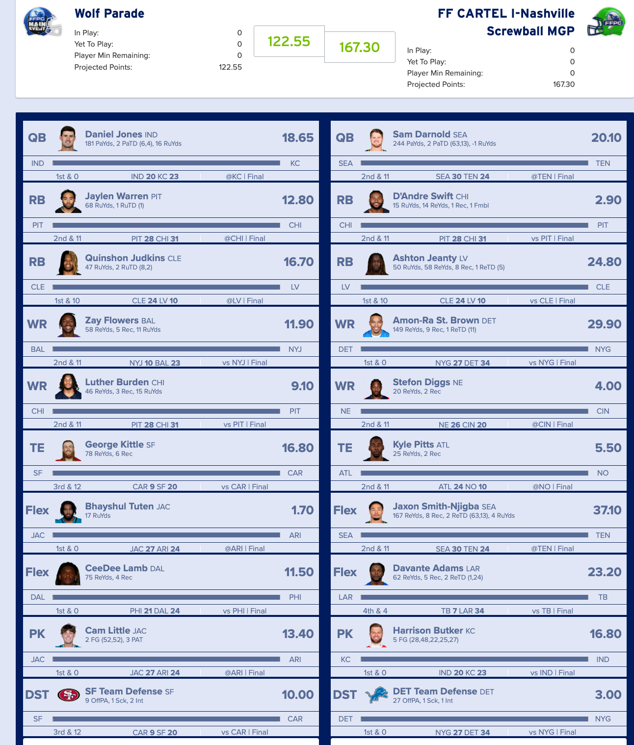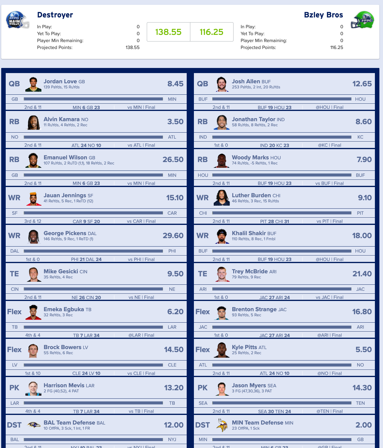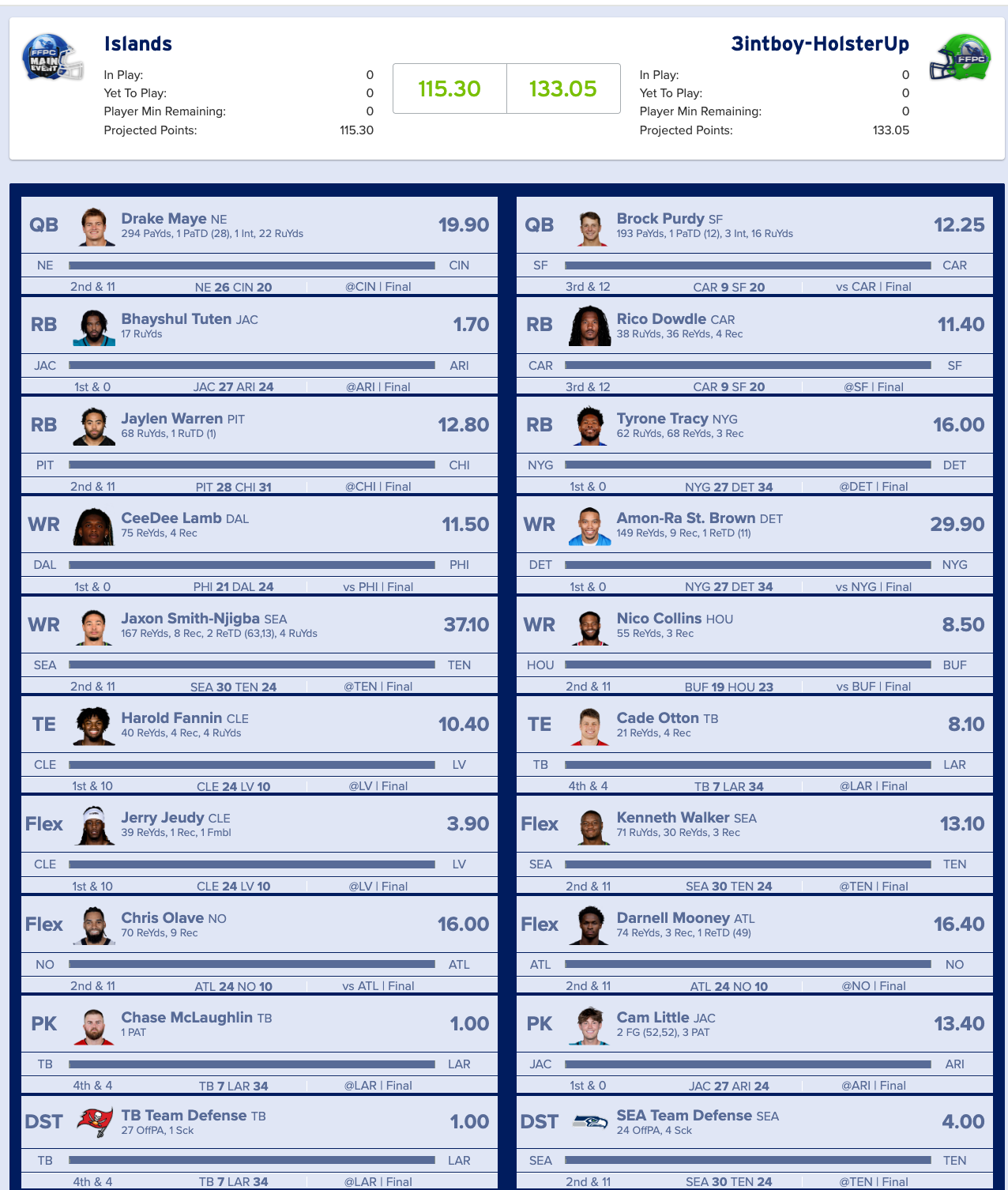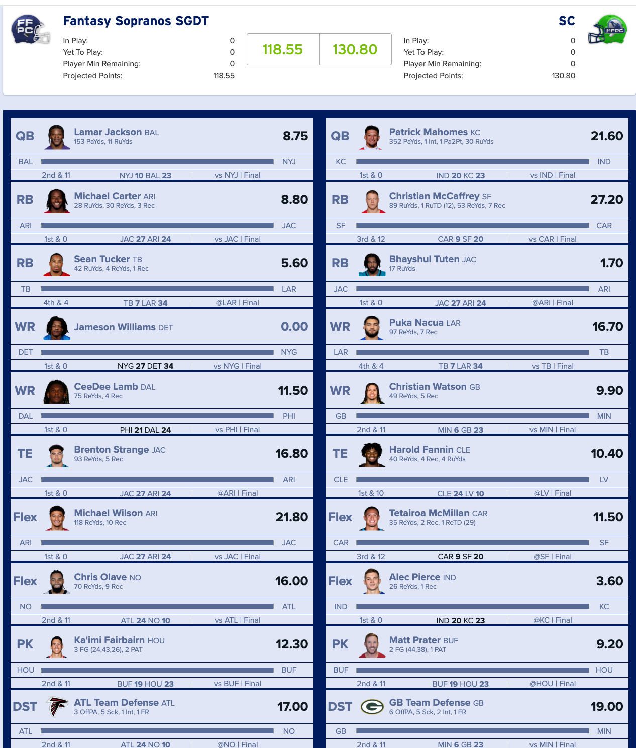 My team had one of its worst performances of the season, and had a huge sweat heading into Monday night. My team remained well ahead of the 5th place team, but the team that had the next highest points put up a monster score, and was ahead by 30 points. The second field goal by kicker Matt Gay secured my team the 4th seed, and now we get to try and win a spot into the sprint these next two weeks.