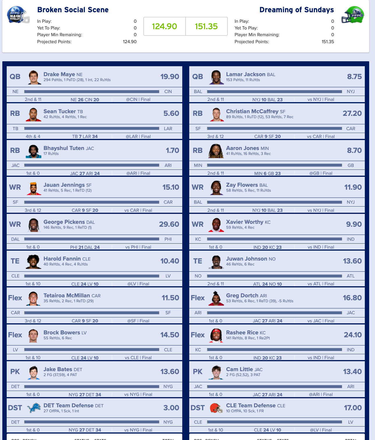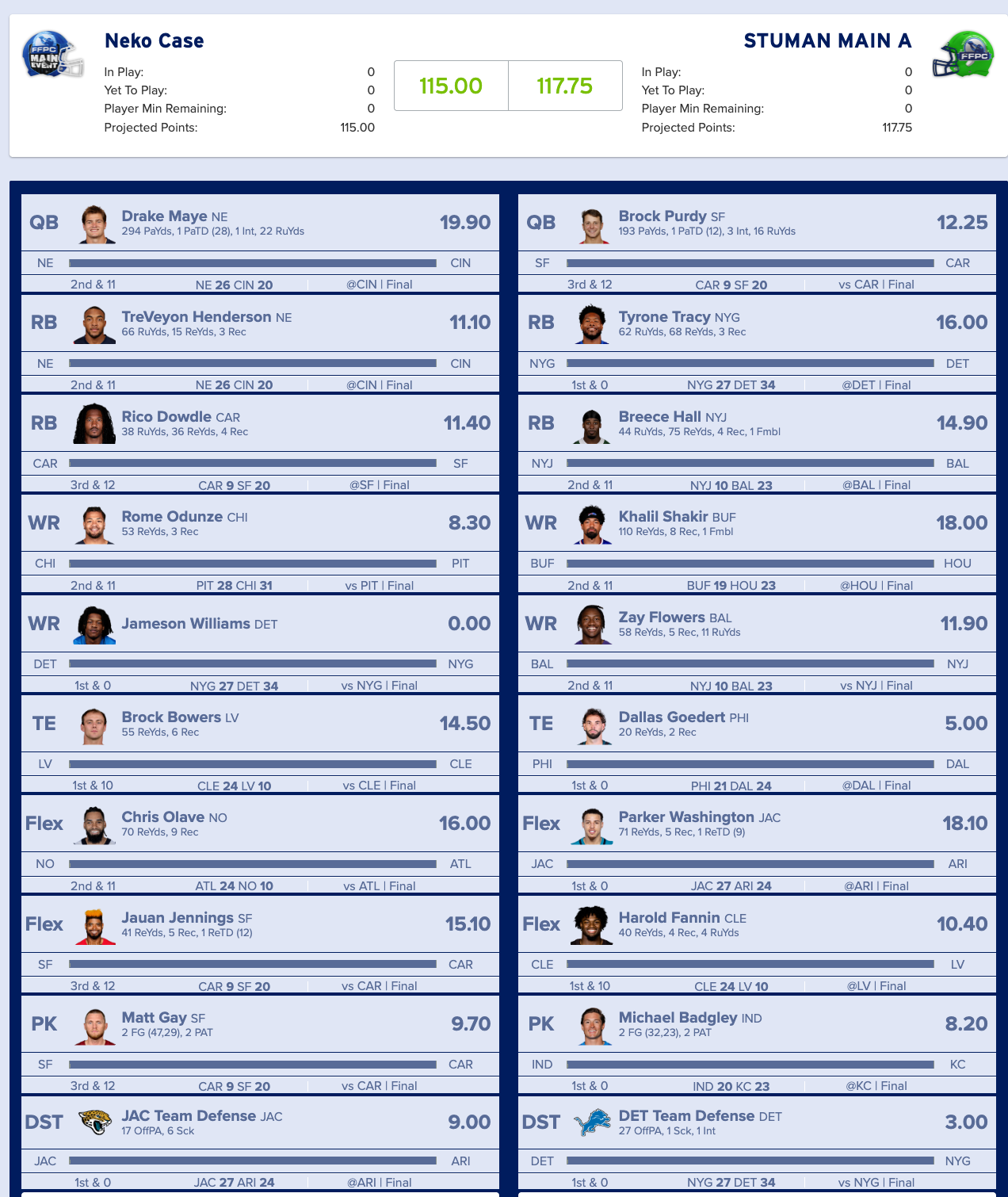 The Stat Chasing team fought hard til the bitter end, but ultimately fell short. The team they were matched up against here were the actual team they needed to outscore by 20 points to get the 4th seed. Ultimately the team couldn't survive the running back flops and Jamo goose egg.