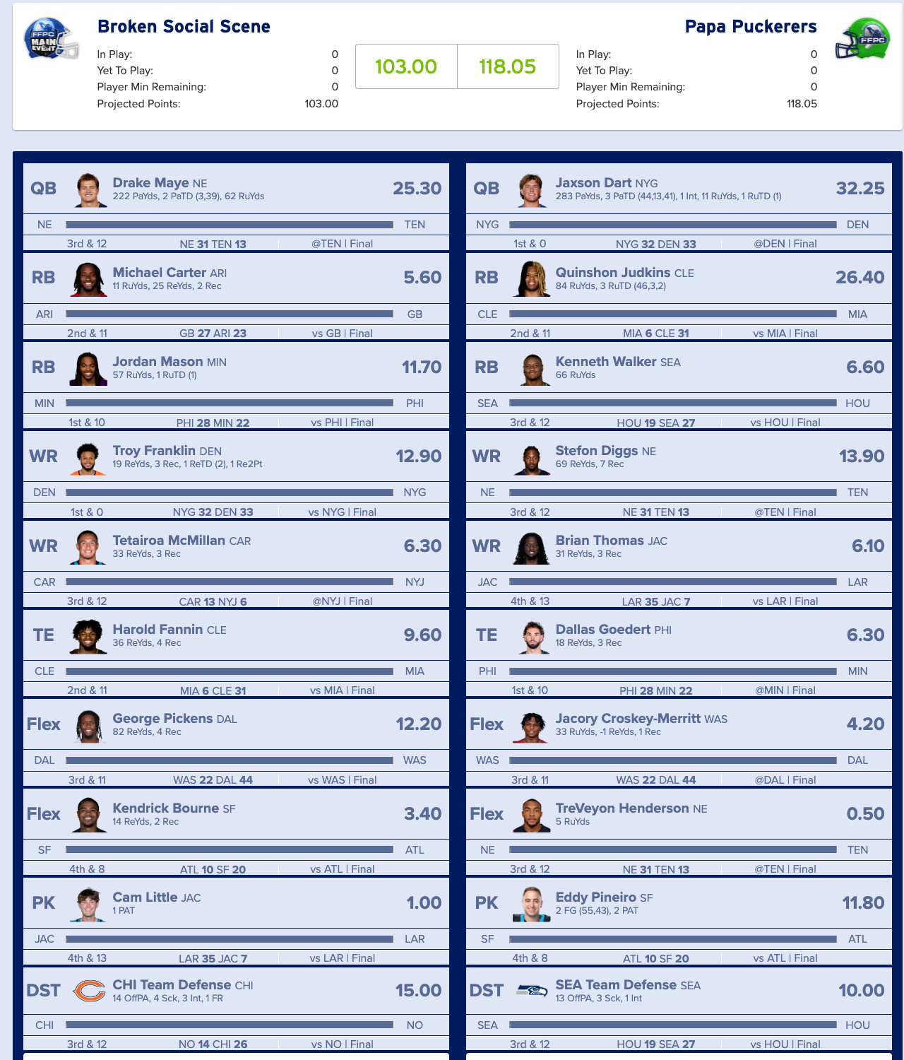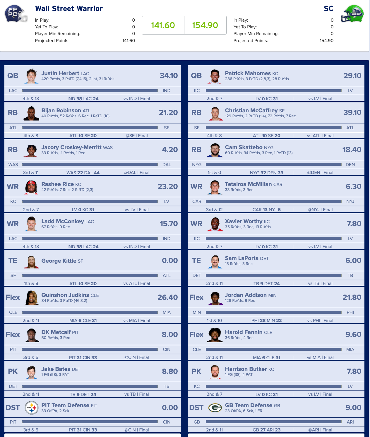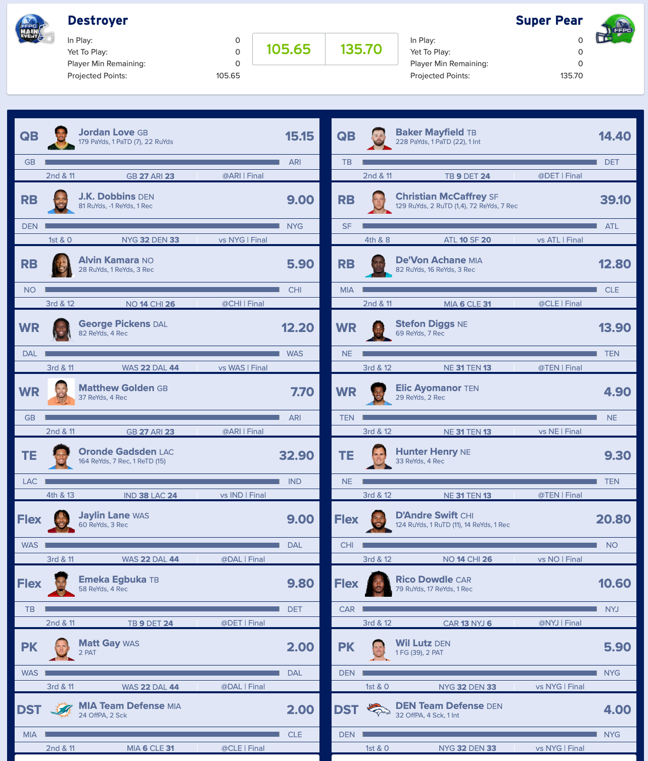 Destroyer lost another one, but still managed to hang onto 5th place with points. This team had so many injuries... Bucky, Garrett Wilson, Calvin Ridley, Bowers, Jennings, Egbuka. Landing on a couple fun rookies feels like a win, hopefully we can make up ground this week and get some players back soon.