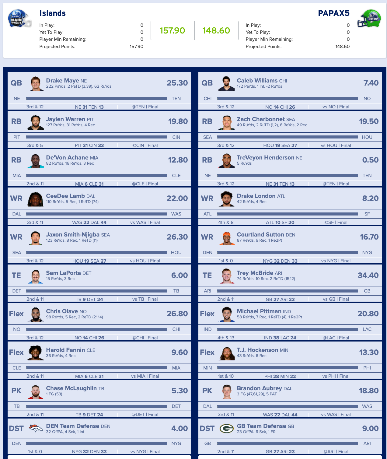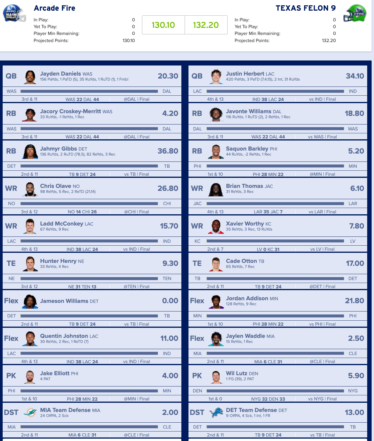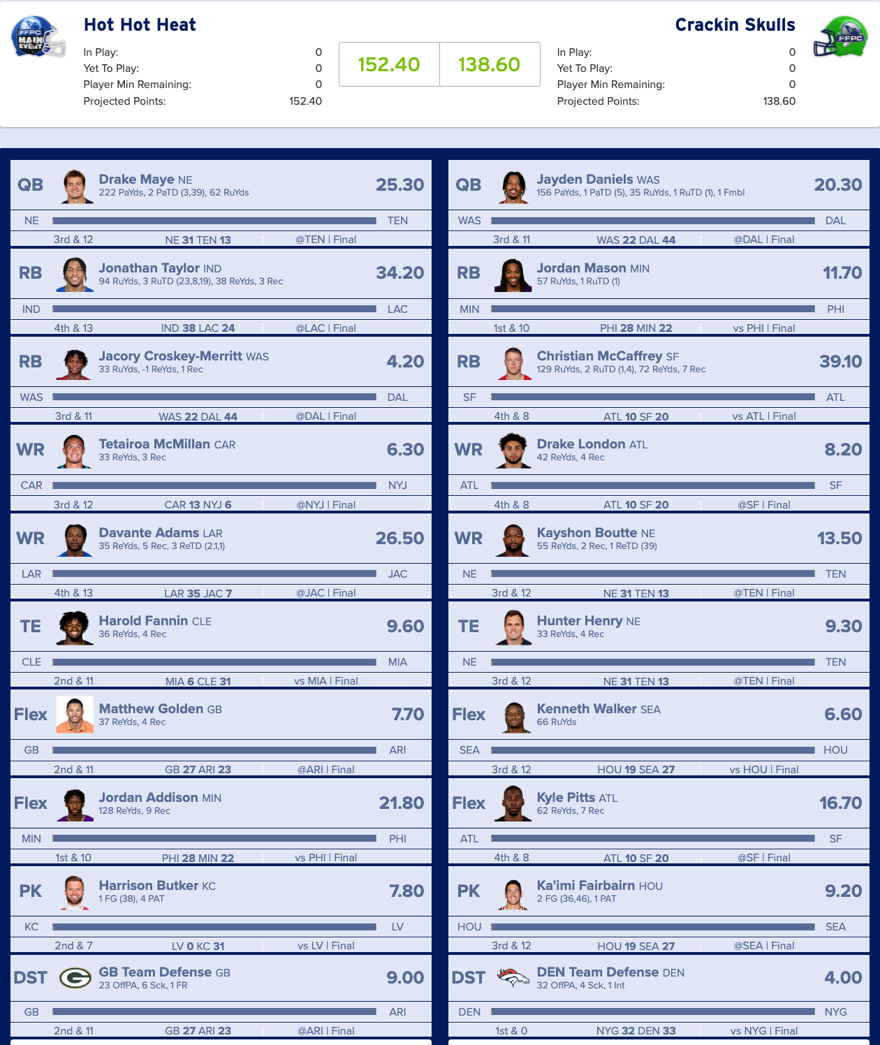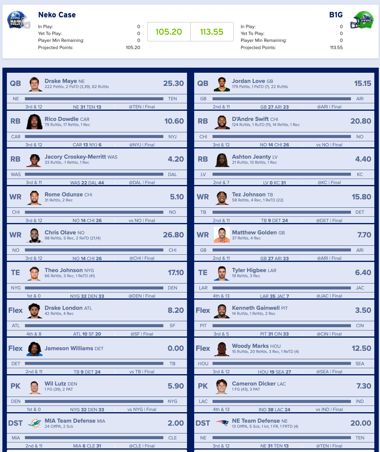 Destroyer lost another one, but still managed to hang onto 5th place with points. This team had so many injuries... Bucky, Garrett Wilson, Calvin Ridley, Bowers, Jennings, Egbuka. Landing on a couple fun rookies feels like a win, hopefully we can make up ground this week and get some players back soon.