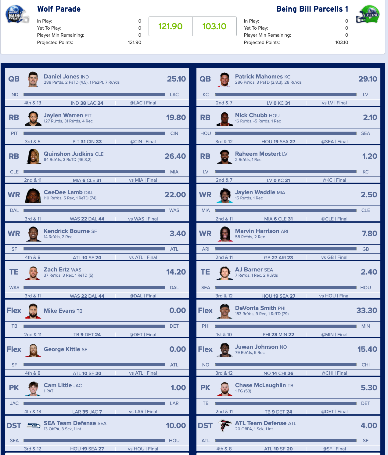 I am not gonna lie this one hurt like hell. I looked at this matchup early in week and felt very confident I would win. Then the multiple busts, if only Bill scored that touchdown. I also lost out on bids for Bam Knight and Oronde Gadsden which hurt as well. I am set up decent for the bye week if I am looking for a silver lining.