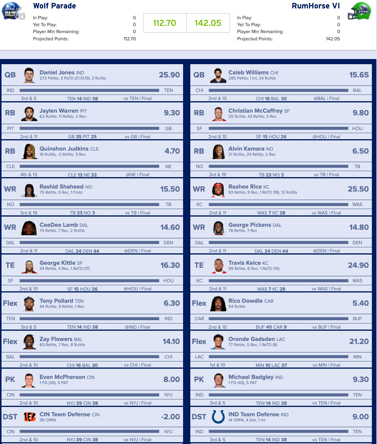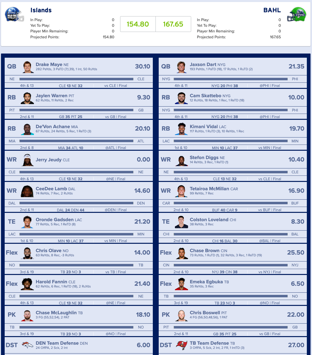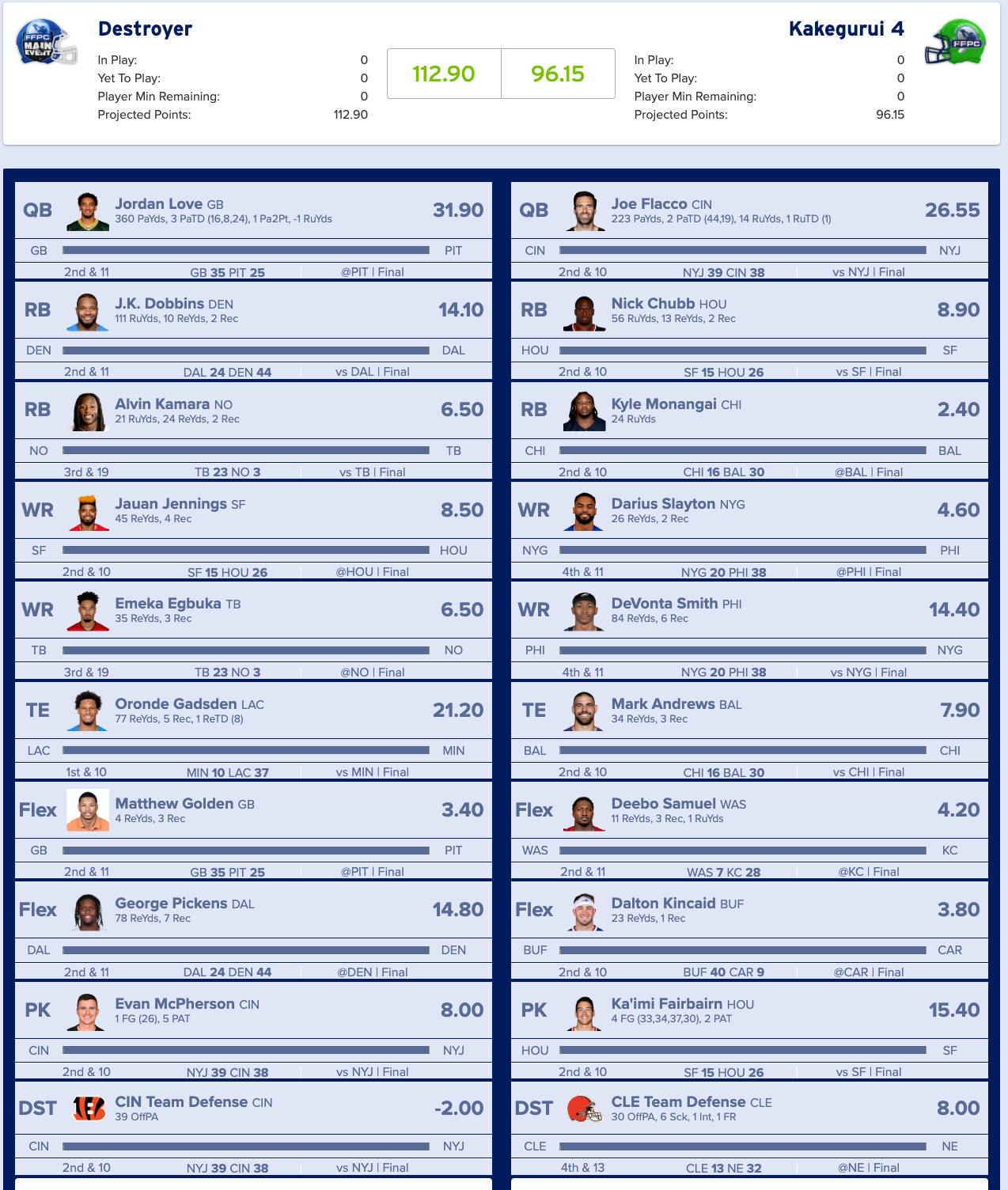 The final team suffered a devastating loss. I'm not talking about the fantasy matchup, but rookie RB Cam Skattebo who was off to a monster start to his career, I wish him nothing but the best. Obviously there is a big whole at RB2 going forward, but the team is still in a very strong position heading down the stretch.