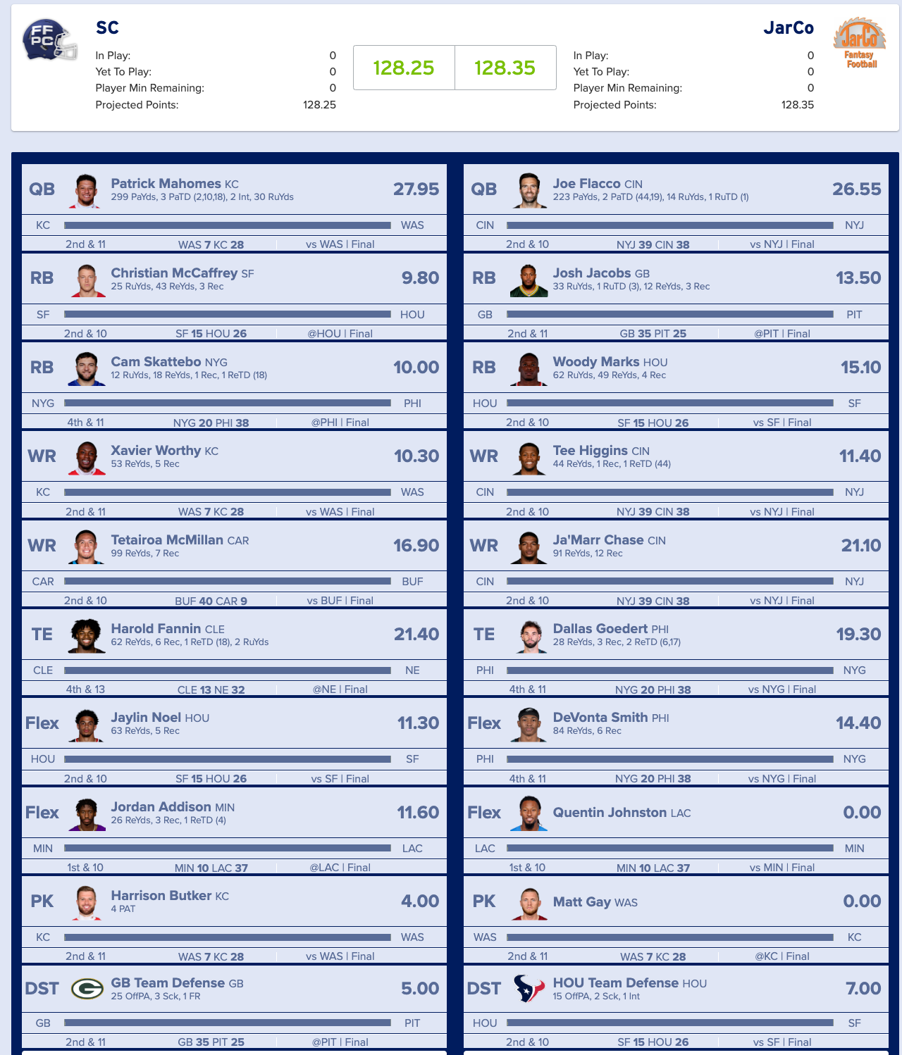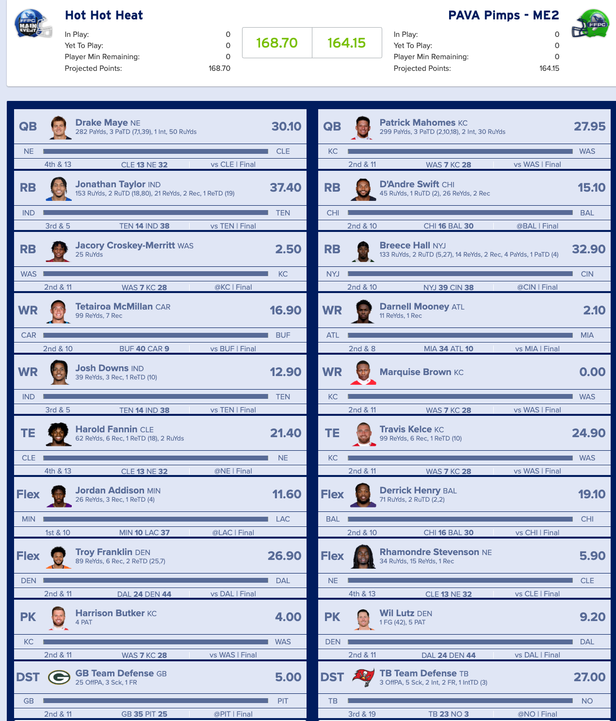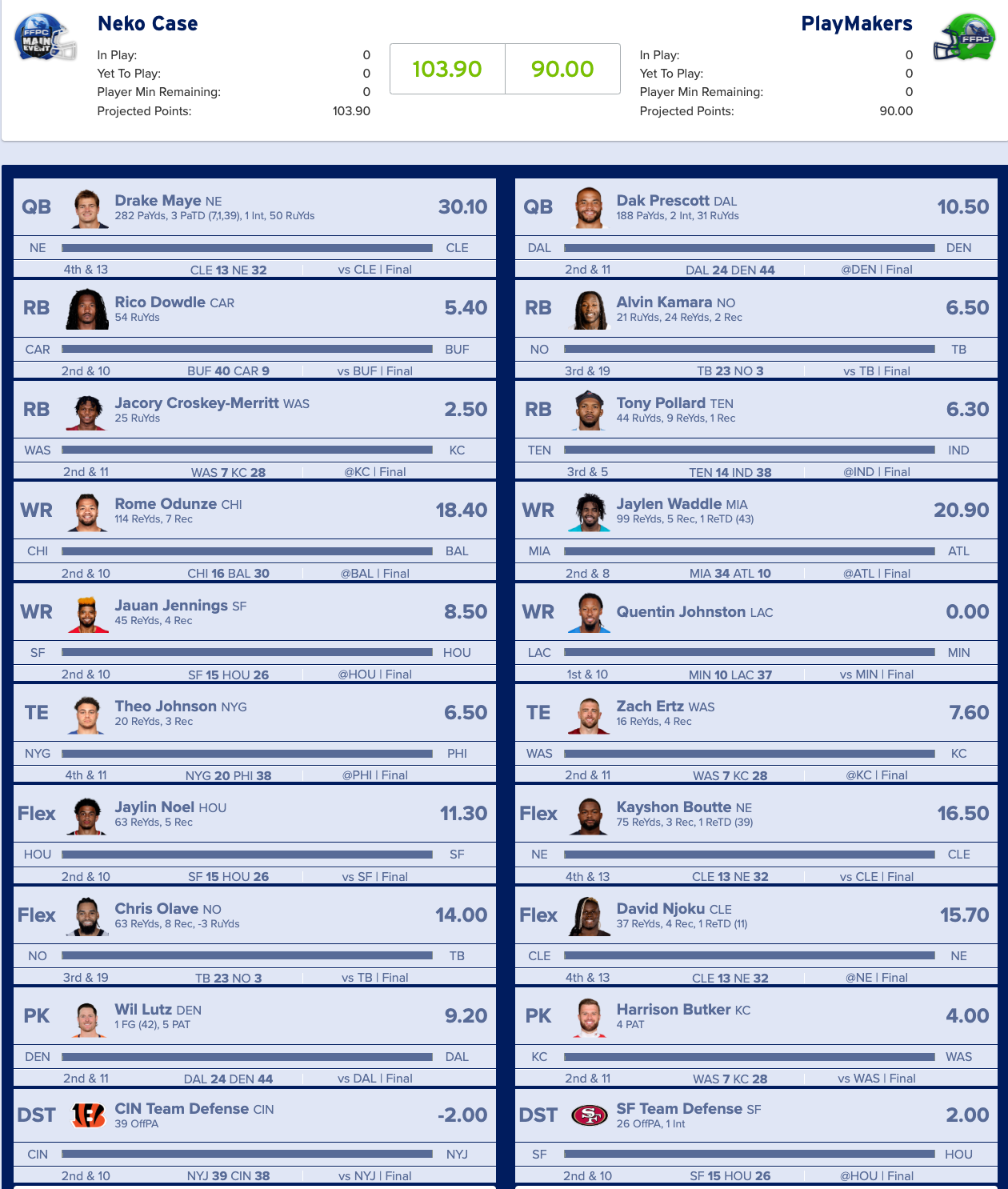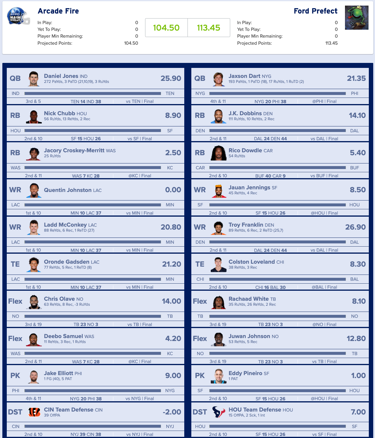 The final team suffered a devastating loss. I'm not talking about the fantasy matchup, but rookie RB Cam Skattebo who was off to a monster start to his career, I wish him nothing but the best. Obviously there is a big whole at RB2 going forward, but the team is still in a very strong position heading down the stretch.