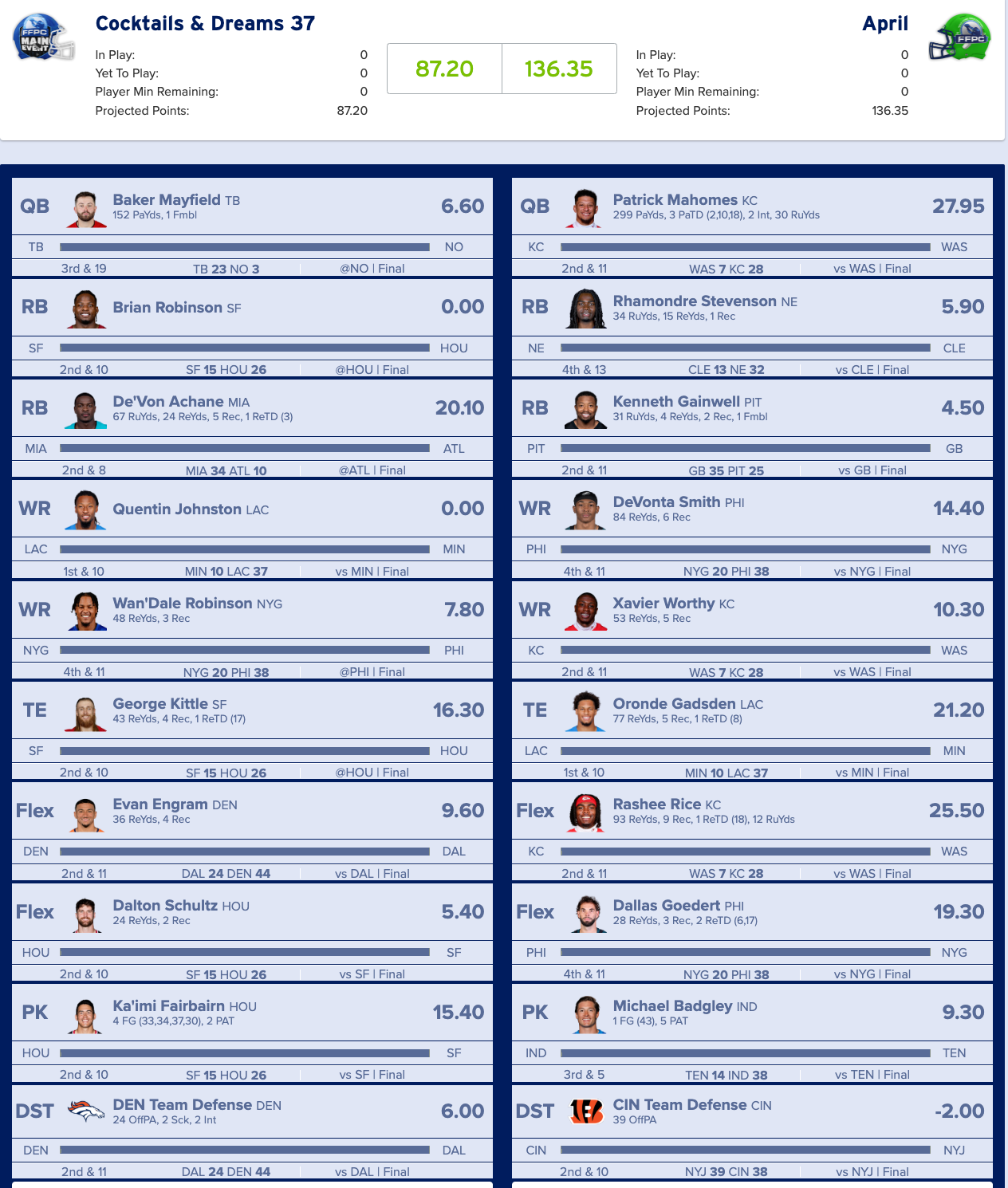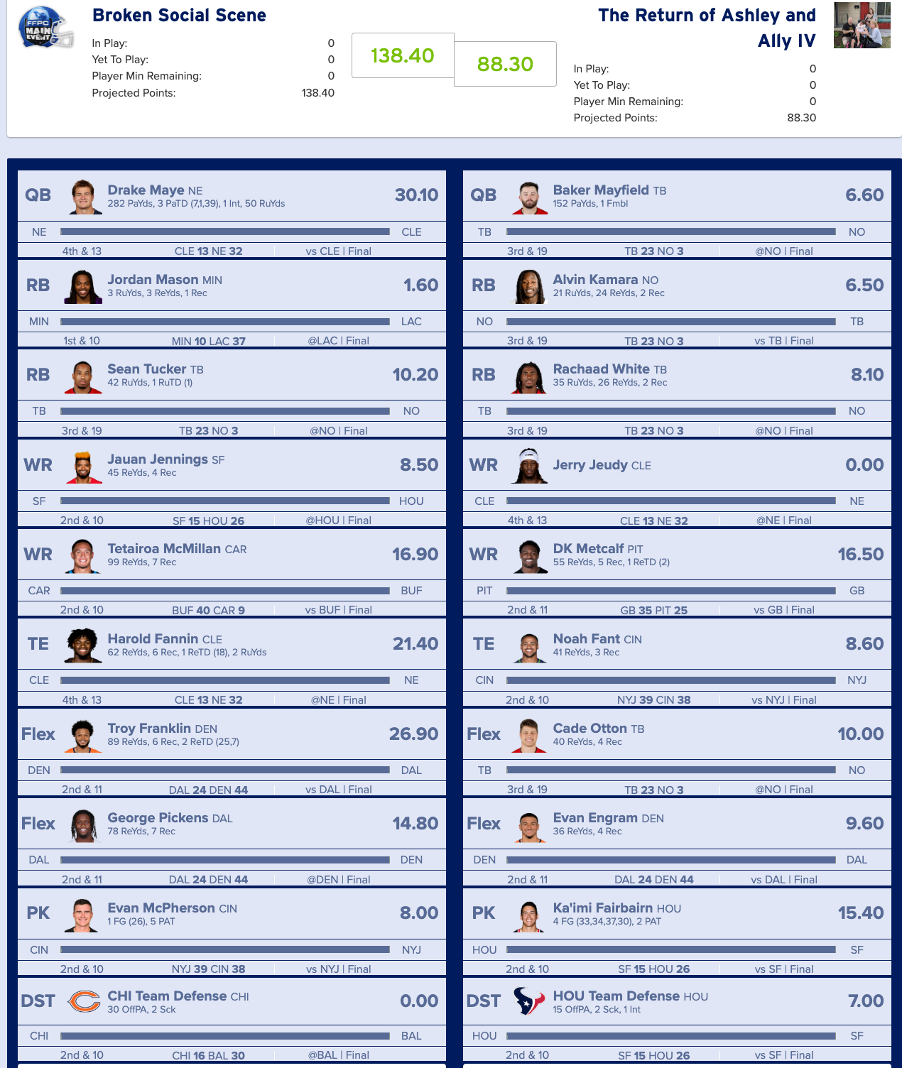 Another brutal loss for a team I thought that turned a corner. Ceedee returned with a pedestrian score while we dropped Mike Evans and watched Judkins leave the game with a shoulder injury. This team has been through the ringer and the record reflects that, but if it can find the ability to put up some big final weeks there is a chance...