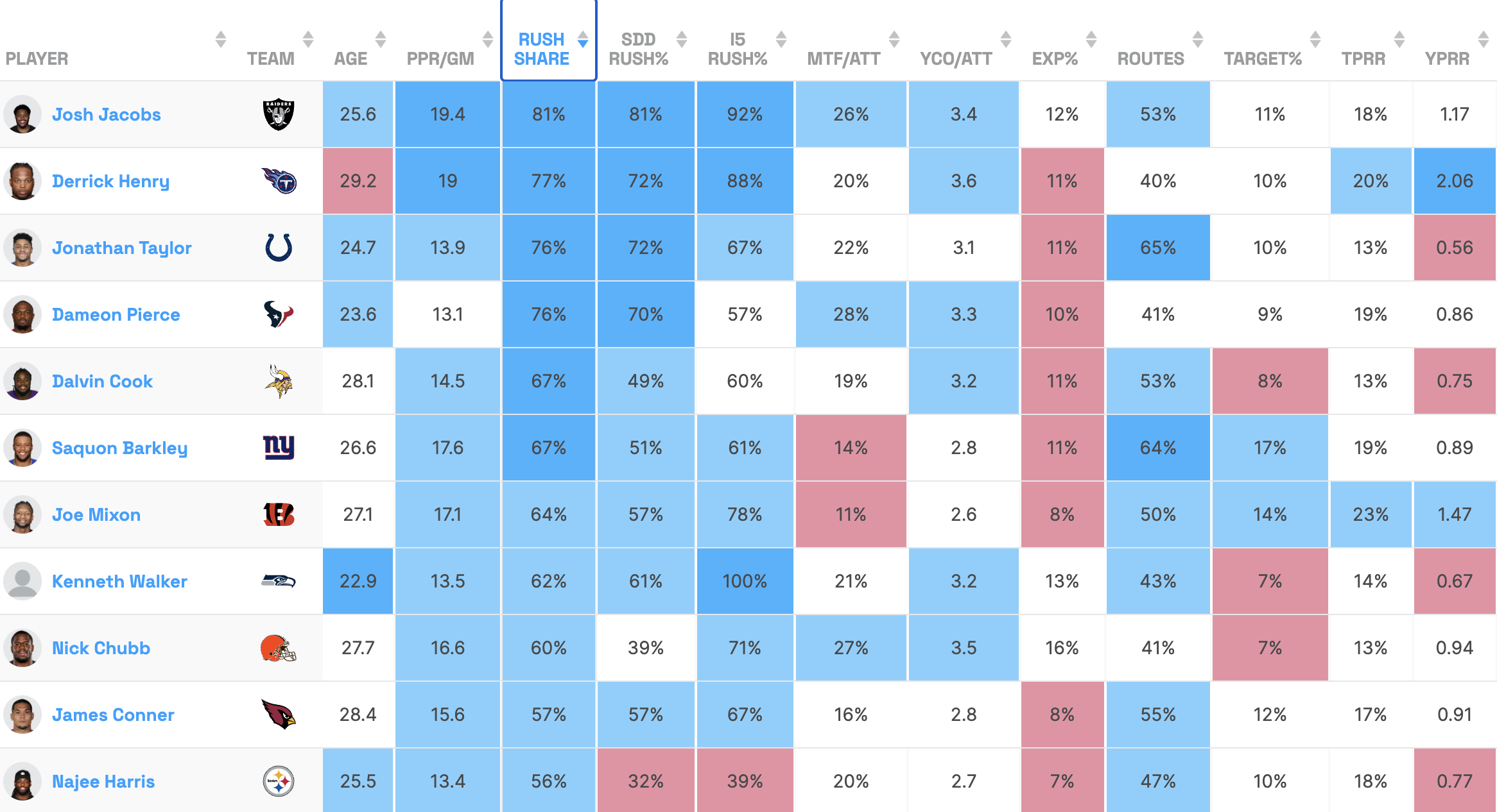 Despite being in an unideal situation, Jacobs still handles a ton of work. With 65% of the Raiders' attempts, he profiles as one of the league's biggest workhorses.