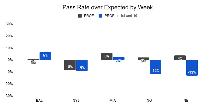 But in Week 5, against an excellent Patriots run defense, the Bills averaged just -0.36 EPA per play, fourth-worst on the week and worse than the Patriots' season-long rate of -0.31, which ranks dead last.
