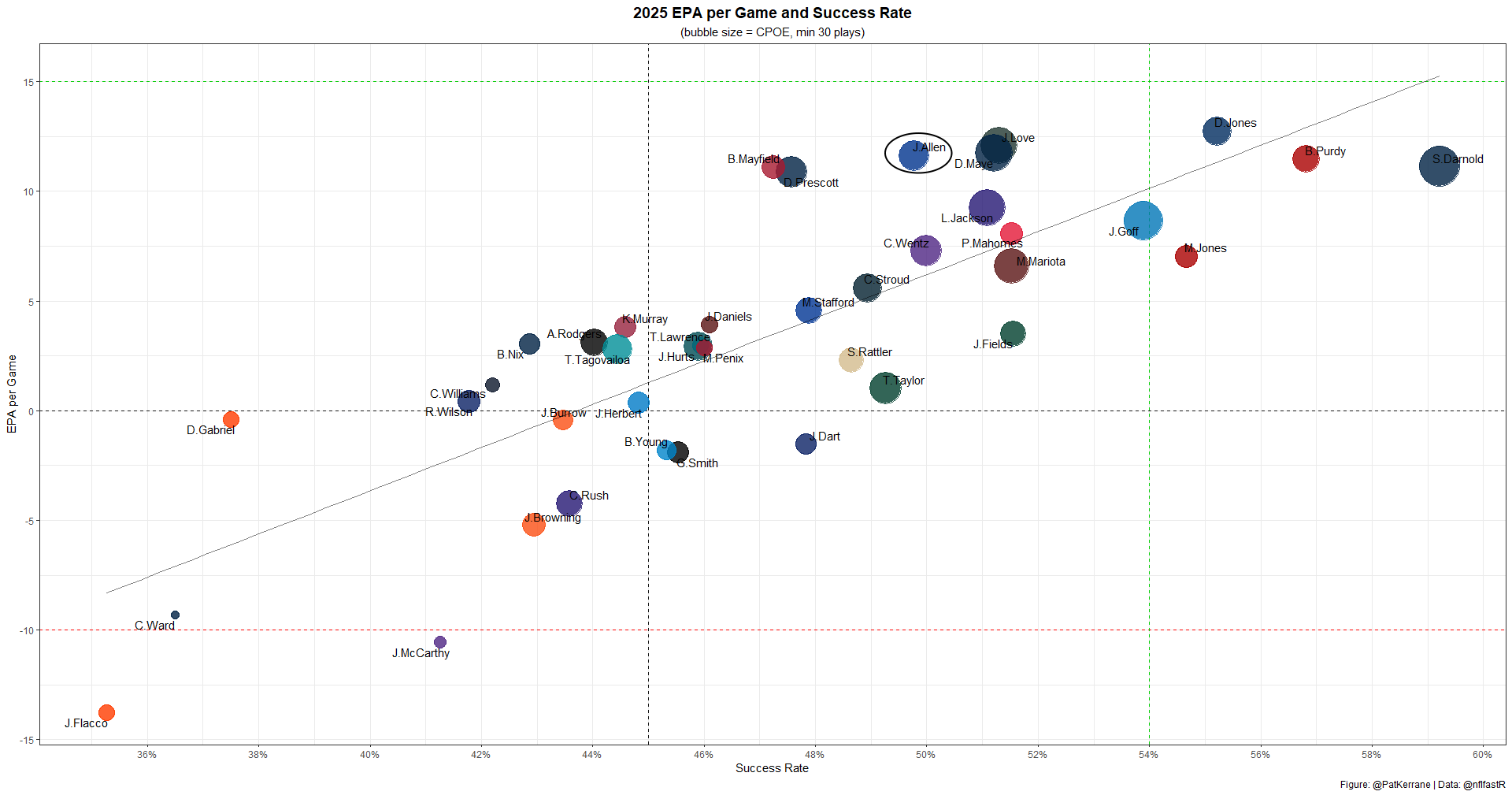 Of course, Allen is arguably the best QB in the league. And even coming off a loss is profiling as an elite QB in the efficiency metrics. Allen ranks QB4 in EPA per game and QB13 in success rate.