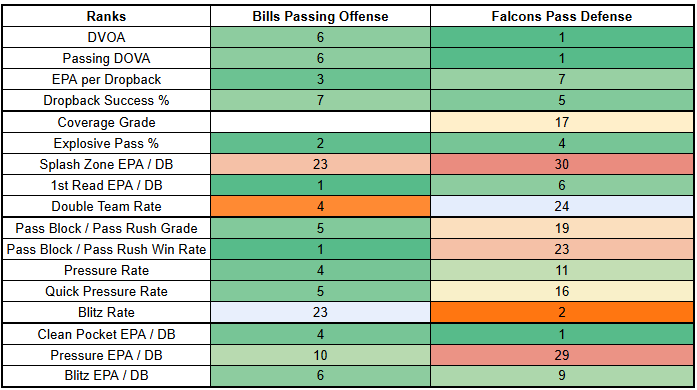 If the Falcons push the Bills here, Kincaid could turn in another strong game. He genuinely looks like their best receiving weapon. He just isn't a lock to be on the field at a high rate. We need team-level dropback volume.