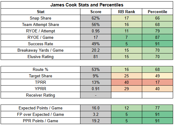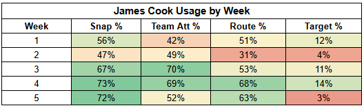This sets up as a bounce-back spot for James Cook, whose snap share is up significantly over the last three games.