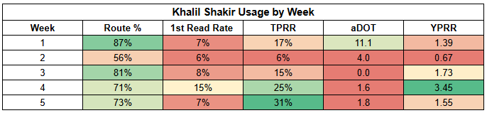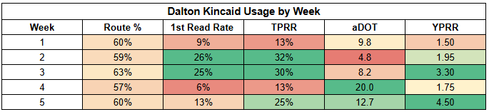 Unfortunately, though, we're only talking about a mini breakout rather than a full-fledged third-year leap. The reason for that is simple—Kincaid is a part-time player. Even with very strong efficiency in two of his last three games, Kincaid has yet to hit 65%+ route participation in a single game this year.