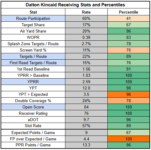 After a career game against the Patriots, Dalton Kincaid leads all TEs in YPRR. He's also popping as a route runner with the best open score at the position.