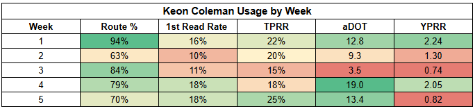 Keon Coleman fell to just 70% route participation last week. His per-route profile isn't bad, but it's not at a level where his limited route participation is irrelevant.