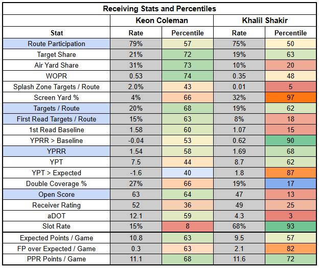 For the season, both WRs look remarkably similar. However, Shakir's targets have been stronger over the last two weeks. Considering that he was working back from injury to start the year, Shakir looks like the slightly stronger play. He's a WR3. Coleman is a WR4.