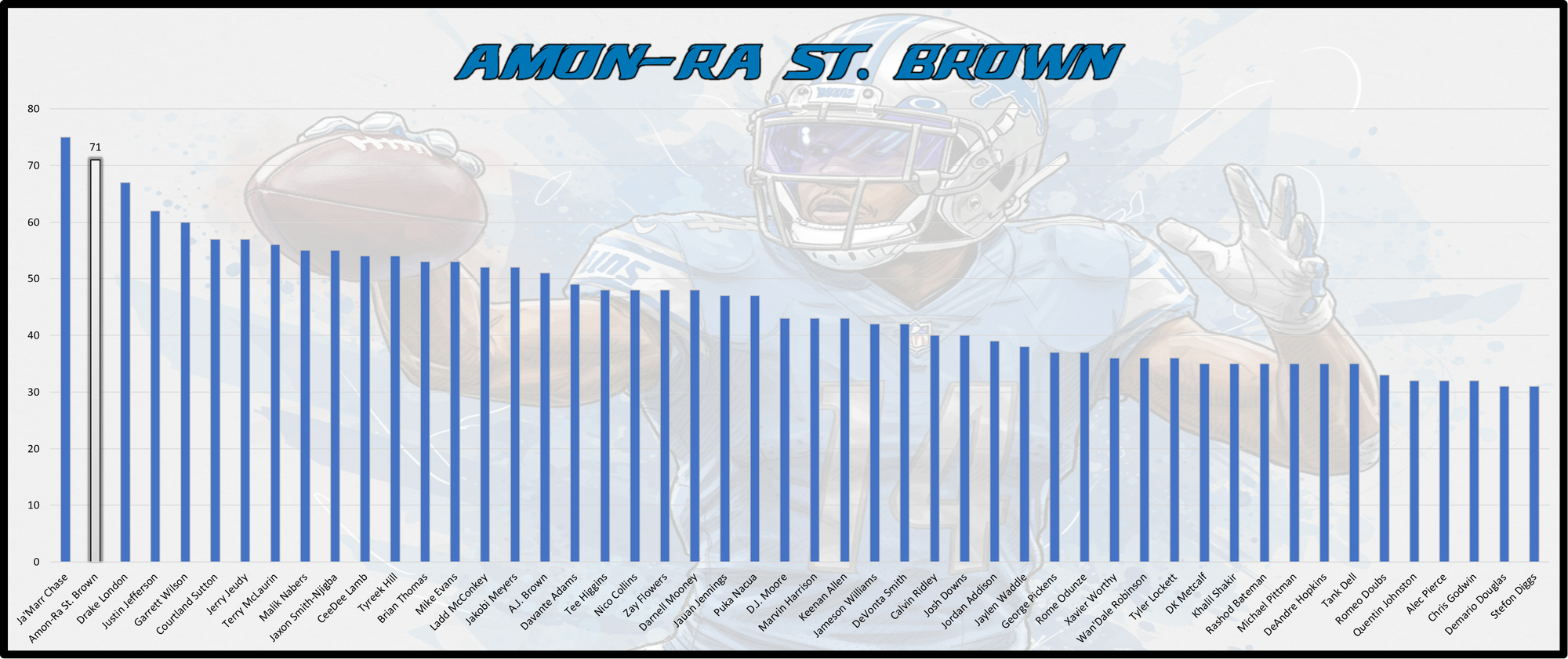 It’s hard to call Amon-Ra St. Brown a massive value as he’s going for a first-round price tag—10.2 on Underdog, the WR6 overall. Even so, he is coming off back-to-back top-three WR seasons and ranked second overall in 2024 in first downs with 71. It is entirely understandable that Justin Jefferson and Ja’Marr Chase should outrank him among WRs in ADP, but it is equally fair to wonder if CeeDee Lamb, Puka Nacua, and Malik Nabers are unjustly nudging him out of their way. St. Brown has been a fixture along the positional apex and a true difference-maker in fantasy football for three straight seasons, and he should be seen as a high-upside option late in the first round.