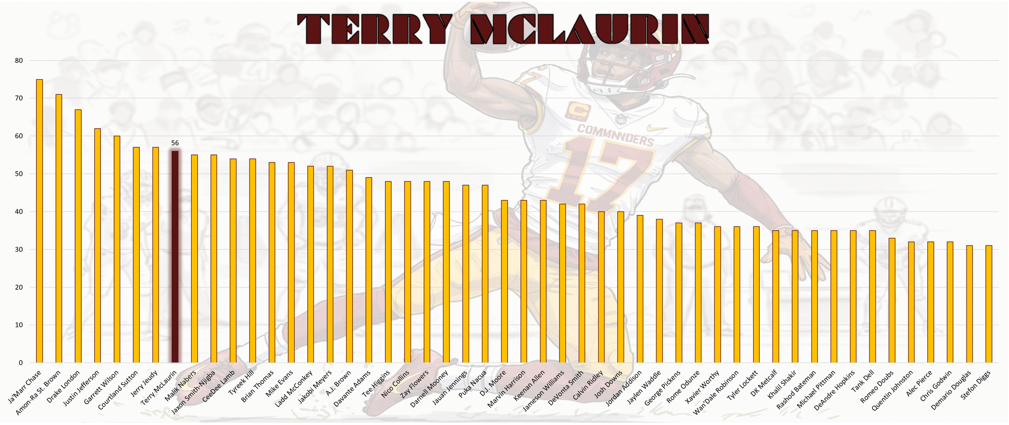 It’s strange that a player can be a six-year vet and still feel like a mystery, but it’s hard to make heads or tails of Terry McLaurin’s 2024. He suddenly posted 13 touchdowns—more than double his steady career average of five—and ranked second among WRs in fantasy points over expected (FPOE), blowing past his previous best of 13th from his 2019 rookie year.