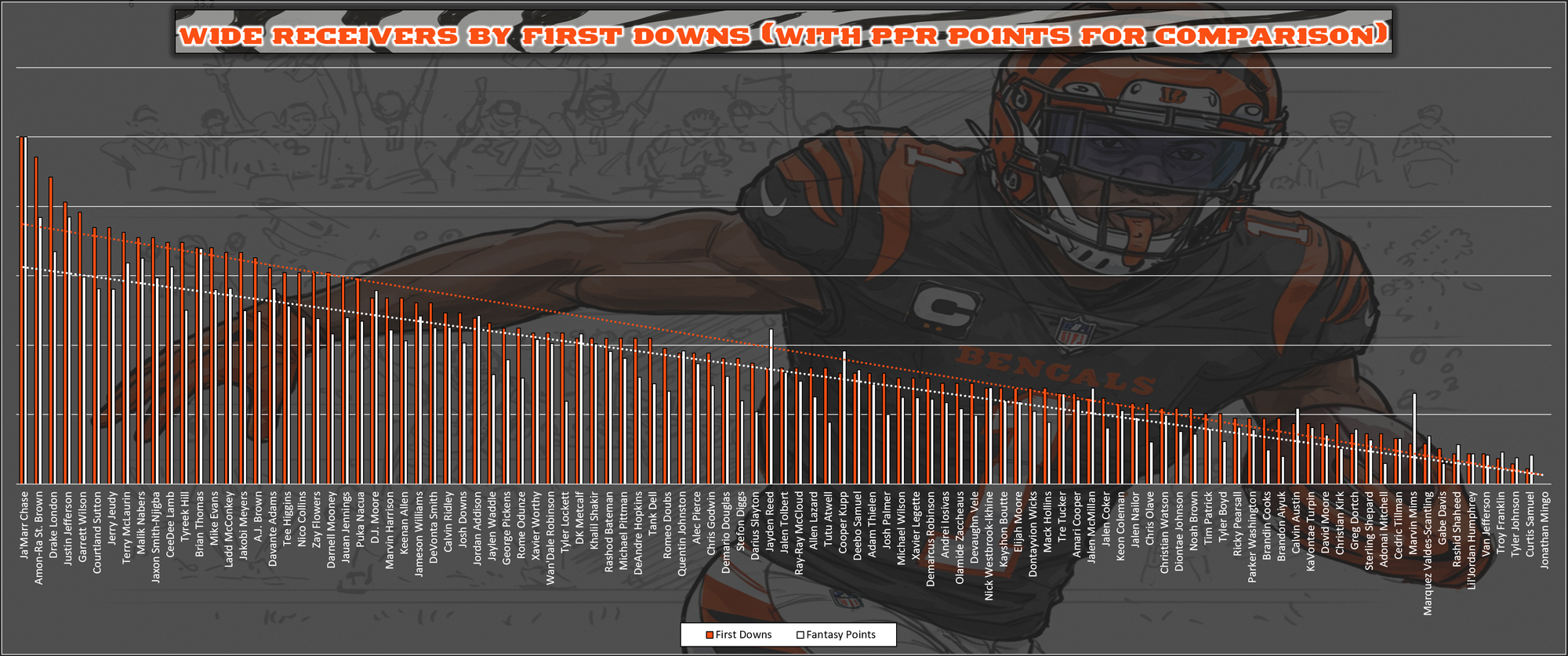 Initially, first downs might seem like an arbitrary stat to emphasize, but if we pause to consider it, we’ll recognize that they highlight the right kind of volume. Each first down reflects a productive, high-leverage target—and a gain big enough to extend a drive. These are the same plays that rack up receptions and yards, the backbone of PPR scoring. In short, first downs filter out empty participation.