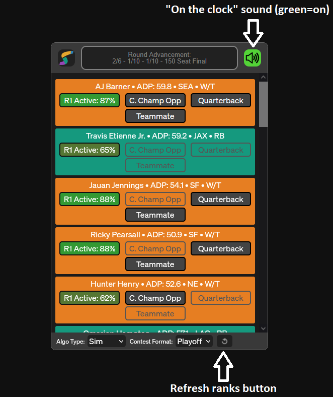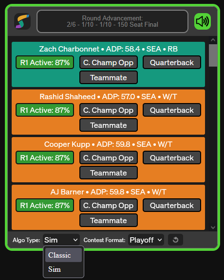If you are a creature of habit and still want to use the previous version of the Playoff Best Ball Sidekick, fear not. You can simply change your "Algo Type" to "Classic" by using the drop-down menu at the bottom of the Sidekick.