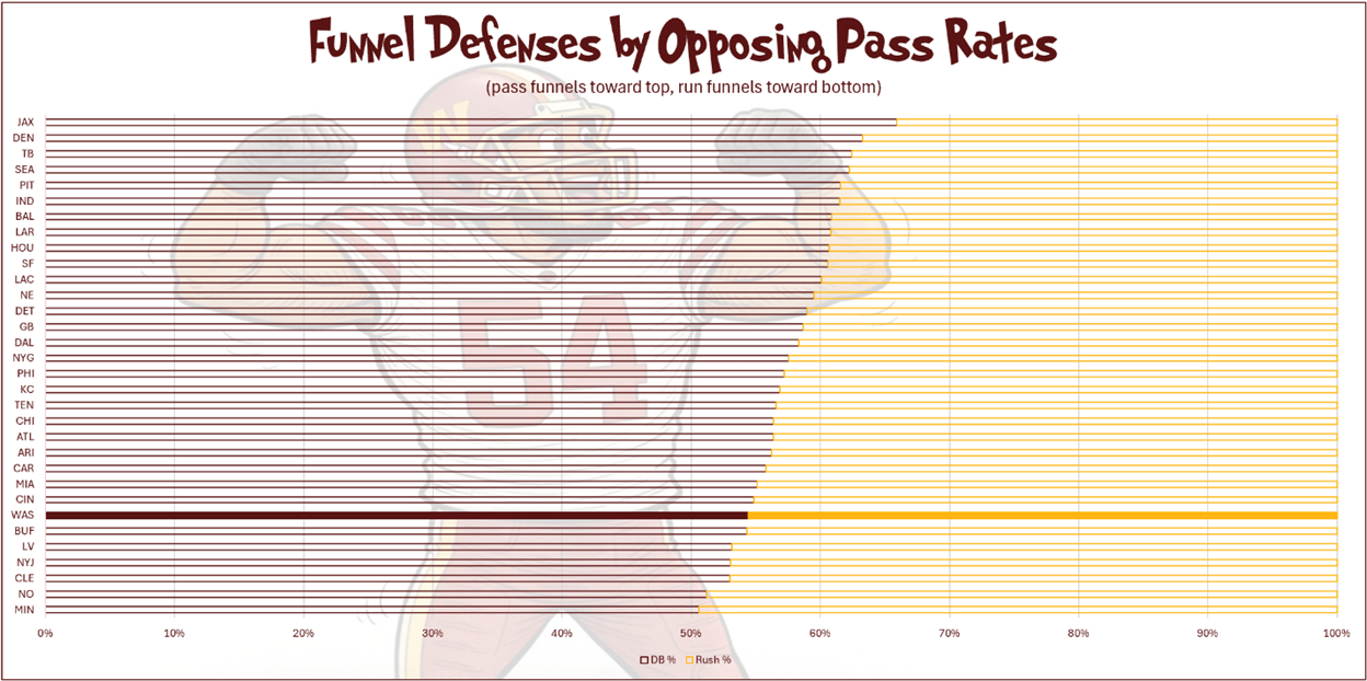 Most teams end up running on the Commanders a significant amount; their opponents’ 54.4% pass rate ranks 26th in the league. This reveals Washington as a run funnel.