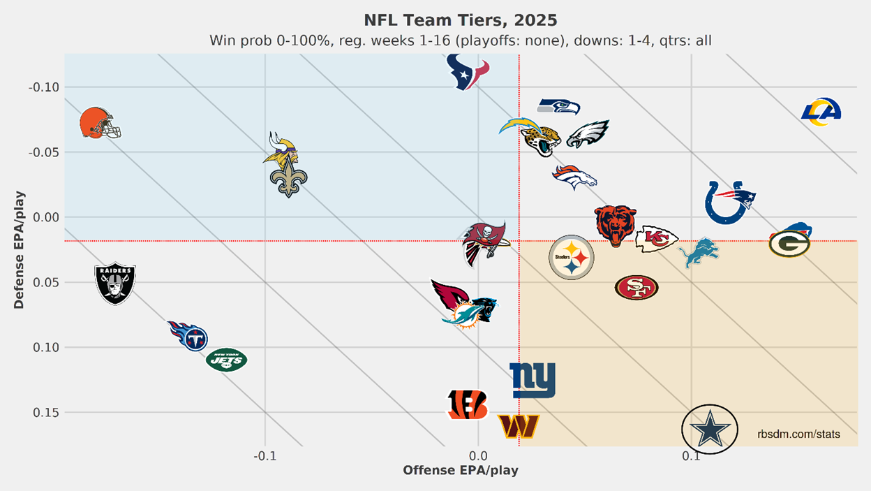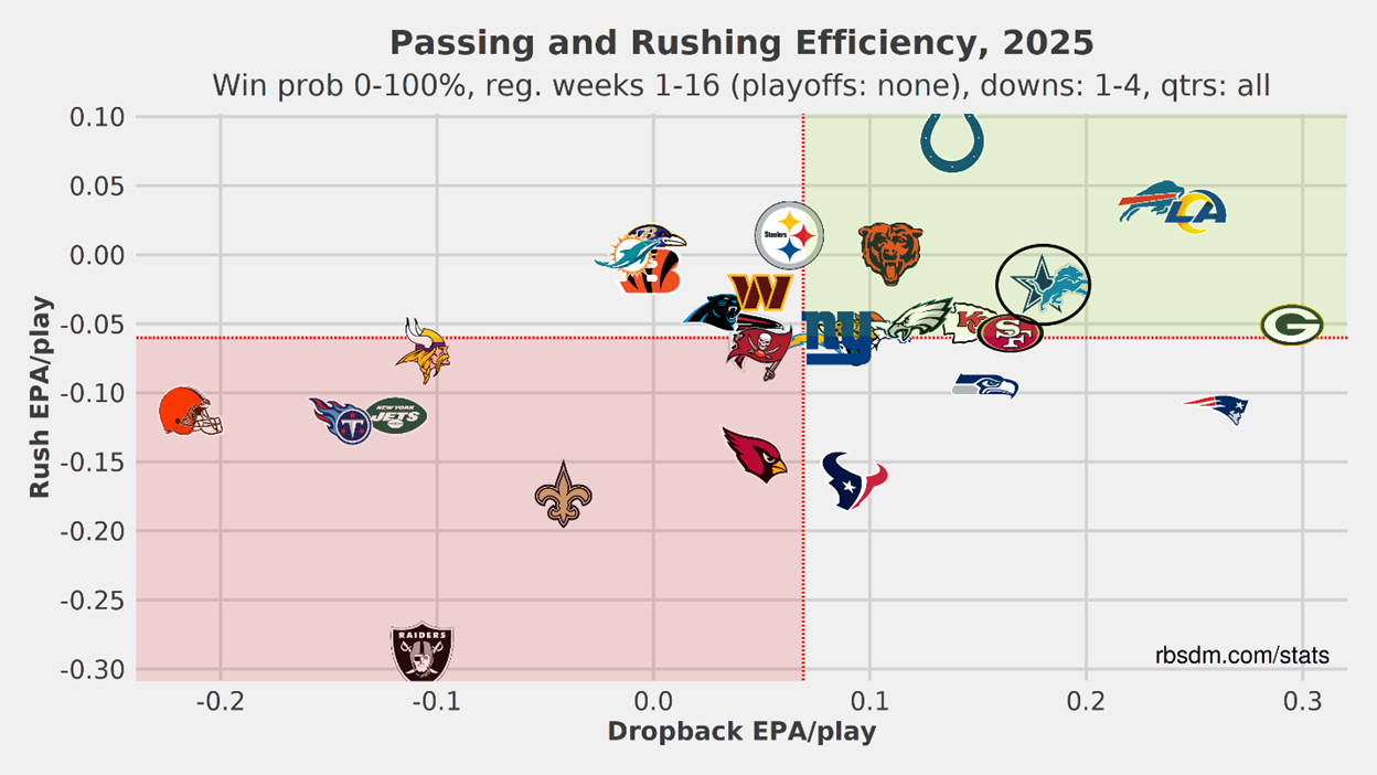 Offensively, the Cowboys are well above average at dropback EPA and slightly above average in rush EPA. Having both teams be good on offense and bad on defense generally creates a good environment for scoring, and it is the main reason for the high over/under.