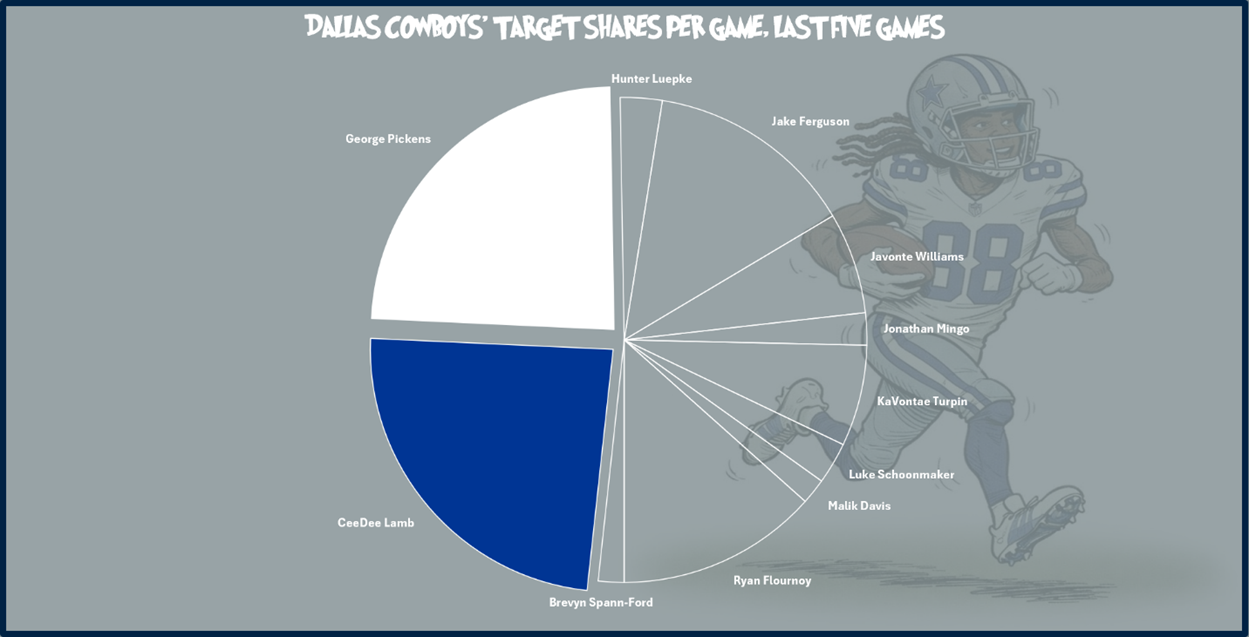 The Cowboys have two players who have at least a 15% target share per game rate in their last five games: WRs CeeDee Lamb and George Pickens (%), who have an equal 22.4% target share in that time.