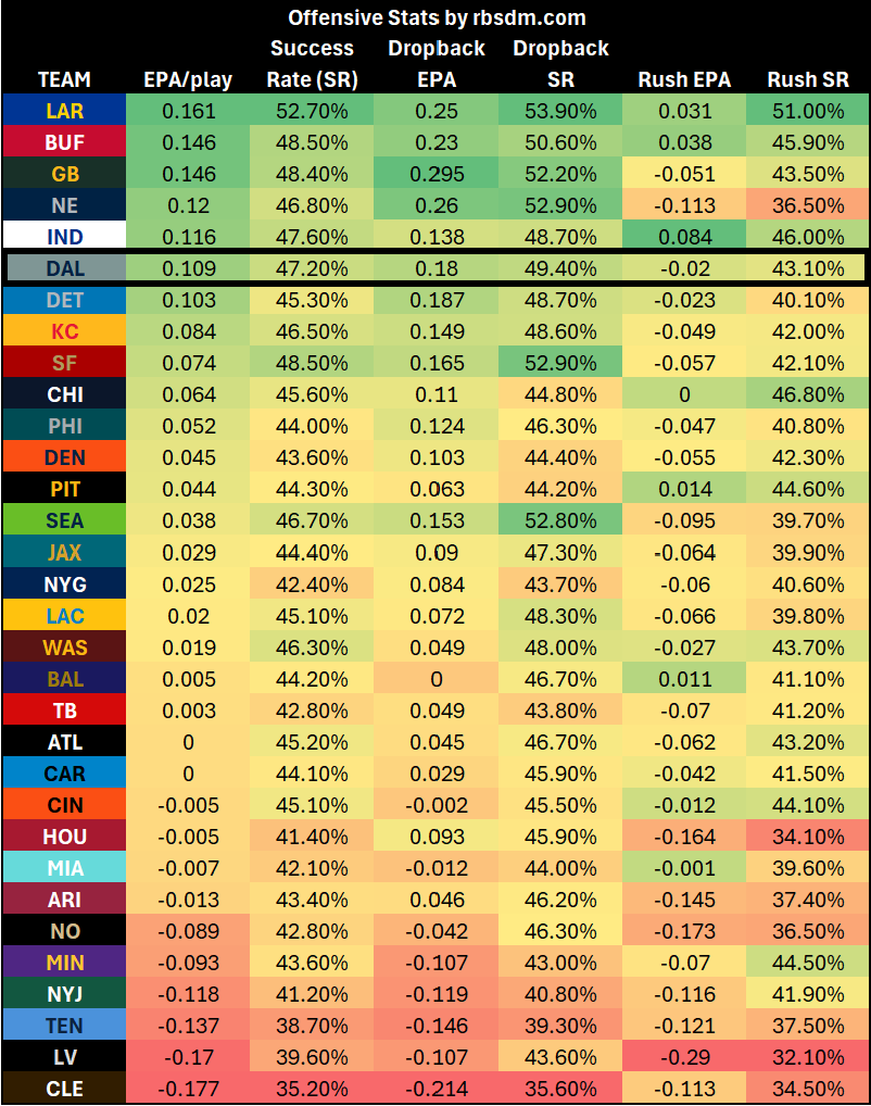 The Cowboys rank sixth in offensive EPA per play and offensive success rate.