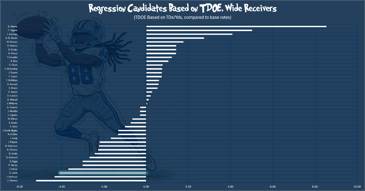 One thing going in Lamb’s favor is that he is probably a positive TD regression candidate. I use a formula that divides TDs/Yds to find each qualified player’s average rate, then compare the player’s pace against the league base rates for the position. It’s not a perfect science, but among the outliers, it can give us some signals to look out for. In that TDs over expected (TDOE) model, Lamb shows up with some of the worst TD luck of the year.