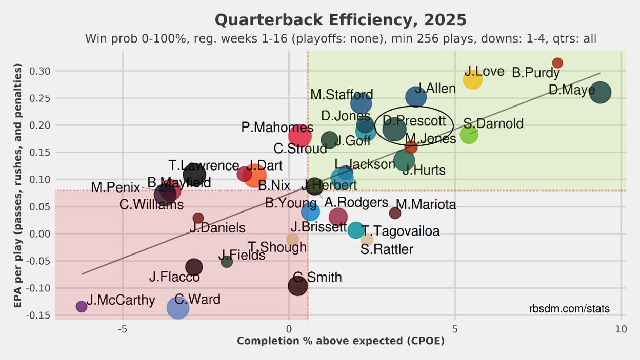 Prescott is well above average in dropback EPA and CPOE.