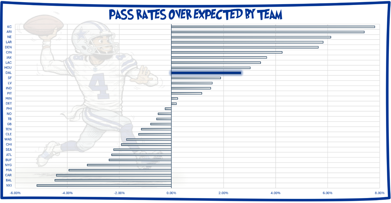 The Cowboys average 25.4 seconds per offensive snap (2nd). They have a pass rate of 61% (T-5th). Their pass rate over expected is 2.66% (10th), so their default calibration is to pass.