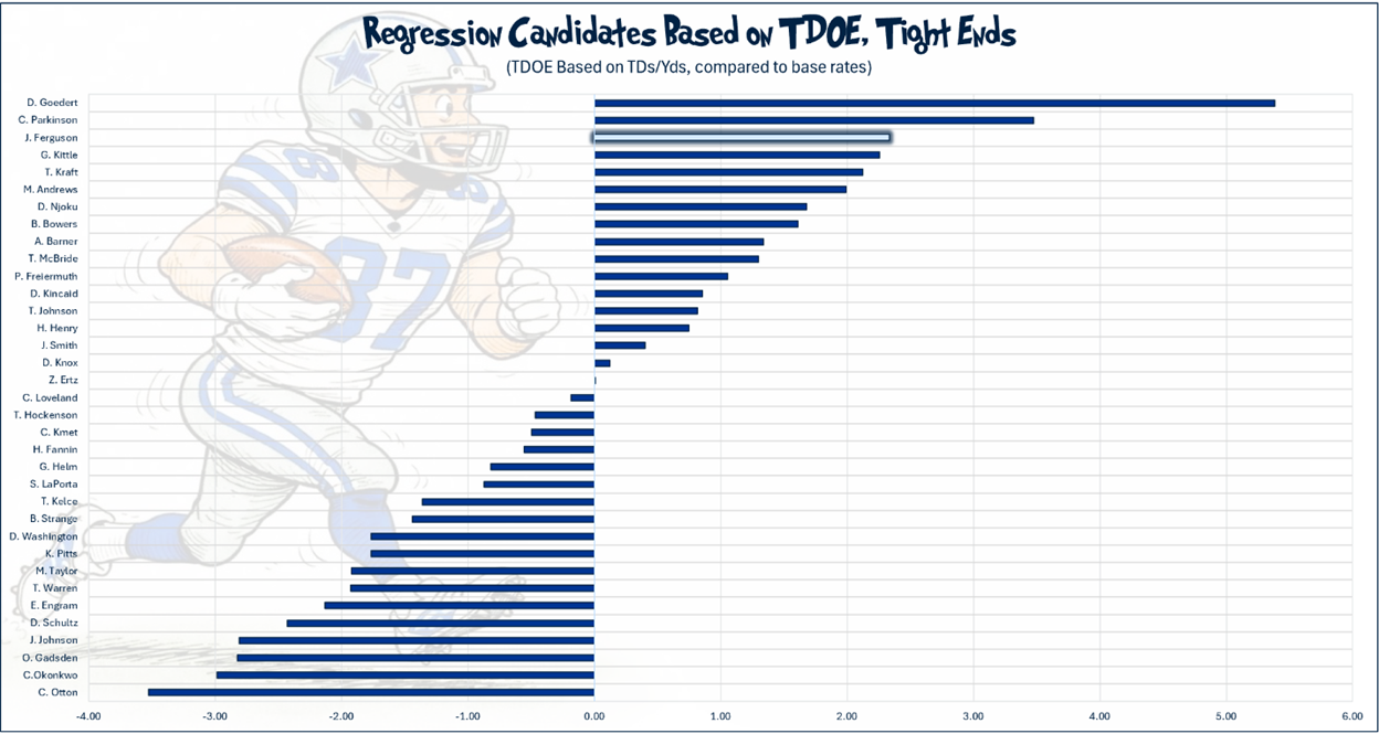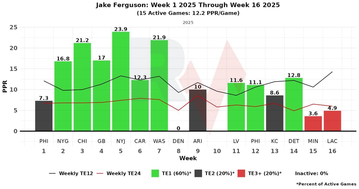 As the entire offense started with a pile of fantasy points in the first half of the season, only to see it all fall to a more moderate amount of points in the second, TE Jack Ferguson has been a microcosm. His per-game chart looks like the profile of a snail crawling to our right.