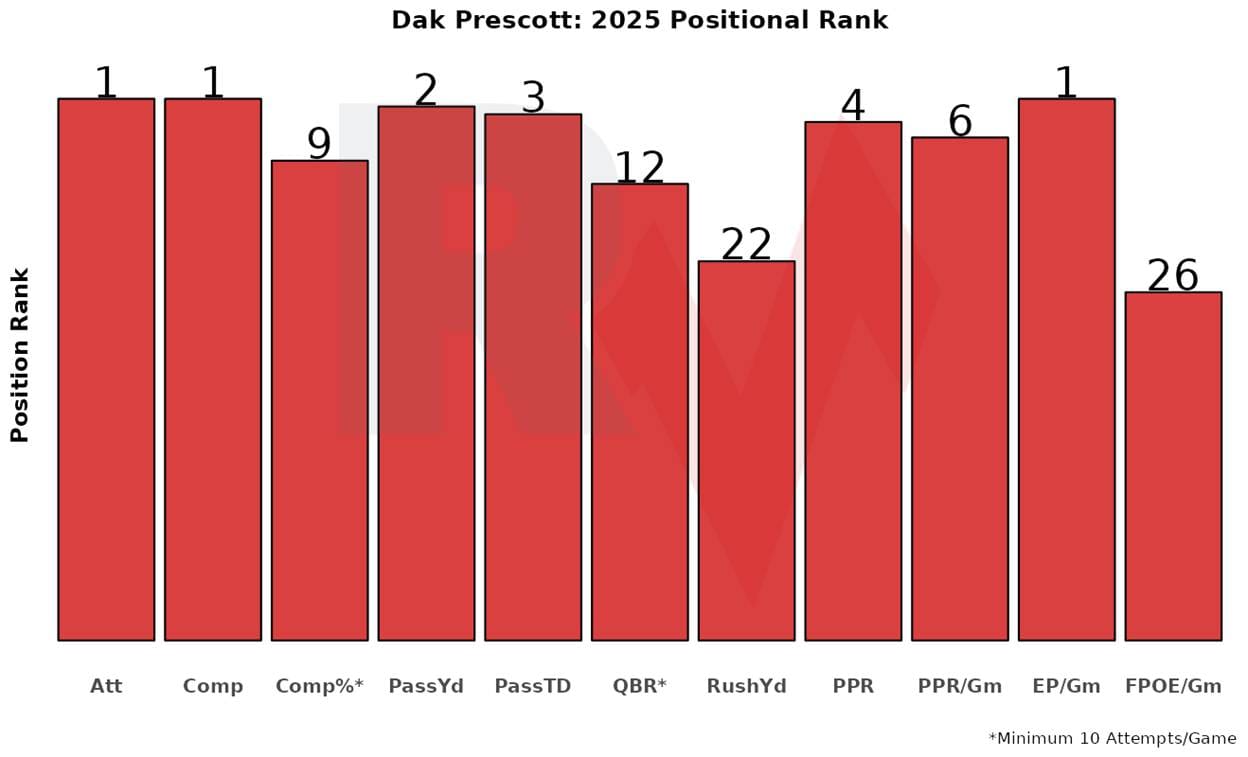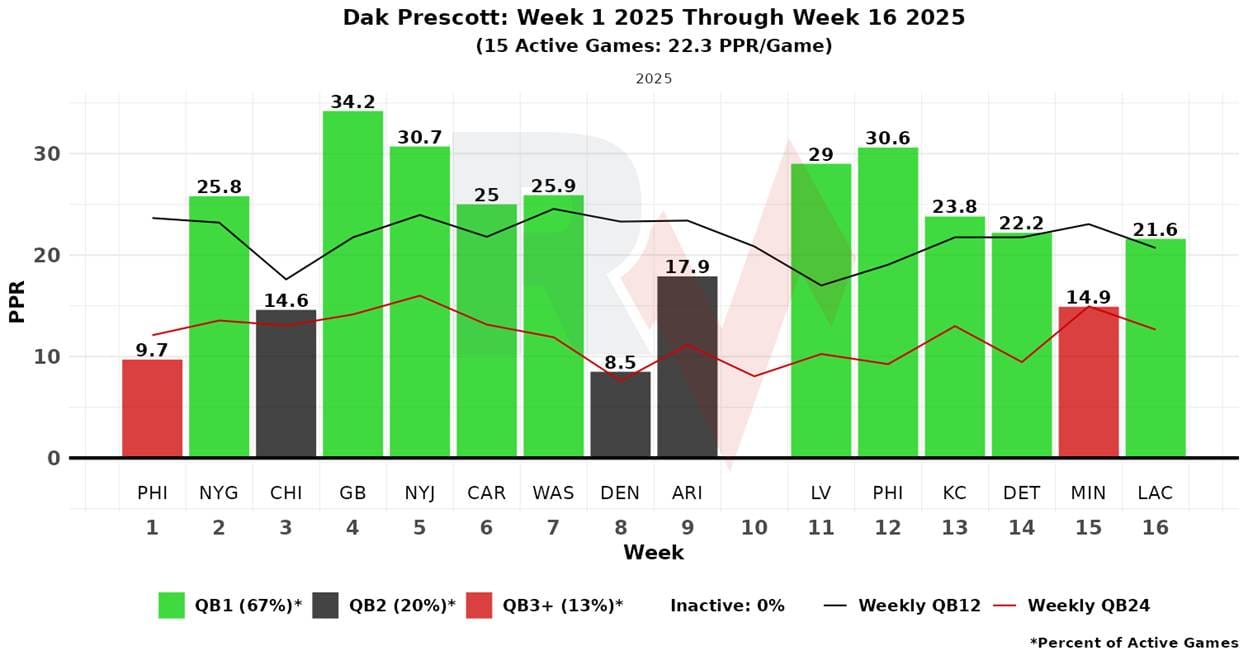 Precott has had 603 dropbacks (1st), converting them into 552 passing attempts (1st). He lacks the rushing platform he once had, but the offense generates so much volume—specifically passing volume—that he has maintained a consistent floor and ceiling; Prescott has been a QB1 in 10 of 15 games, with only two single-digit fantasy outputs.