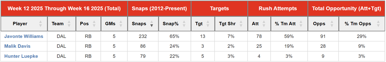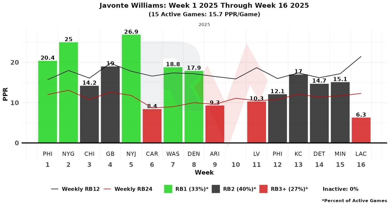 RB Javonte Williams has had a sturdy role all year. He has a 65% snap share, a 7% target share, and 59% of the team’s rush attempts in his last five games.