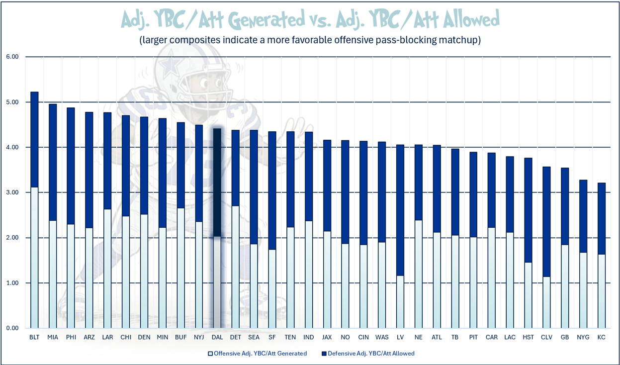 As for run blocking, it is relative weakness against relative weakness. The Cowboys generate 2.04 adjusted yards before contact per attempt (adj. YBC/Att, 20th). The Commanders allow 2.37 adj. YBC/Att defensively (24th). The matchup is slightly in Dallas’ favor when they are run blocking.