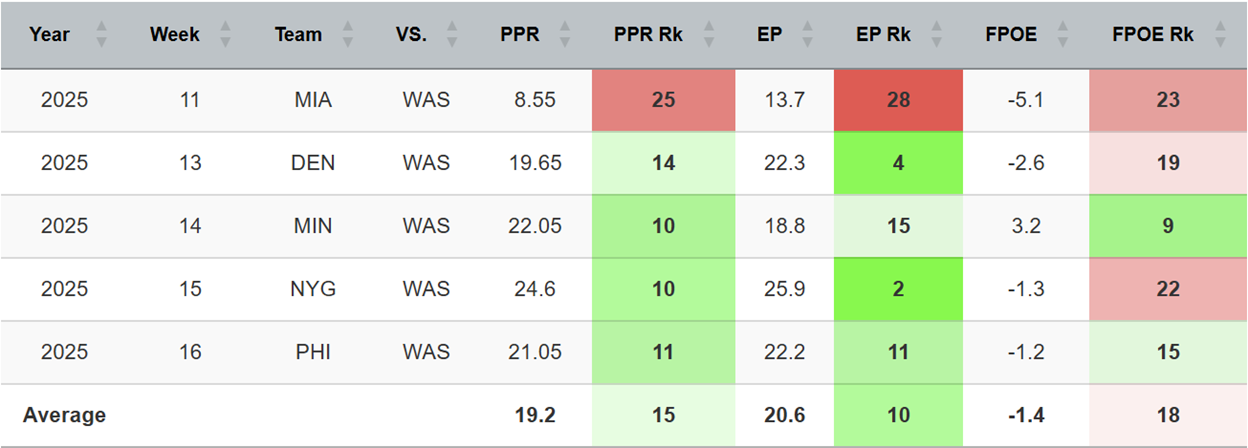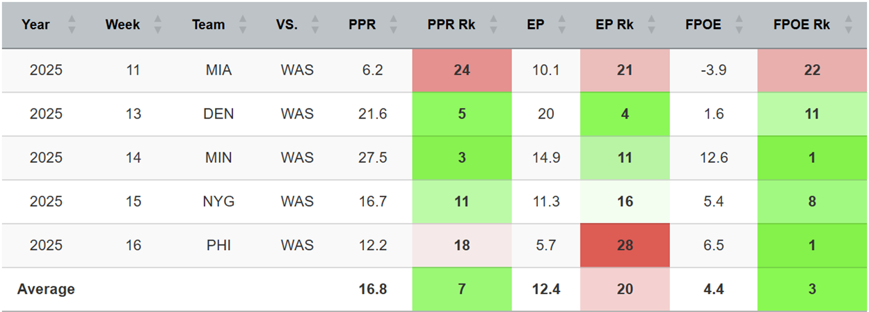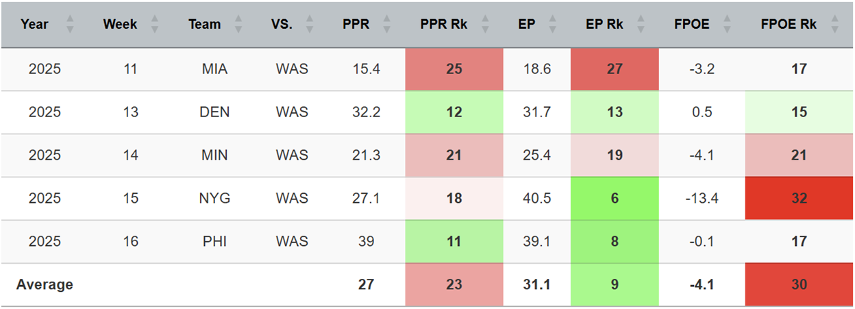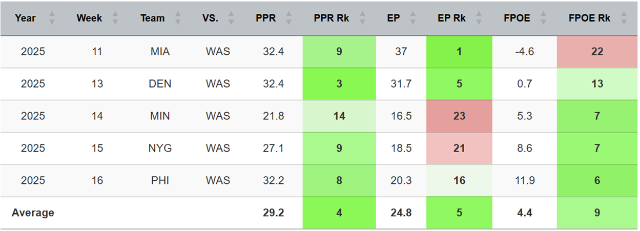 The Commanders have been a little bit stingier against WRs of late, trimming the fantasy points over expected (FPOE) of their opponents to a rank of 30th in their last five games. This has been despite the opposing WRs being quality players.