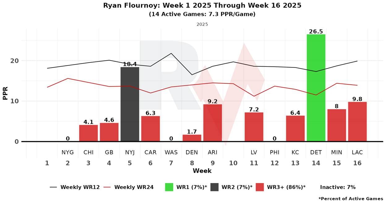 Williams, like the others, had a better first half than second. He hasn’t been an RB1 since Week 8; last week’s 6.3 PPR points were his lowest output of the season.