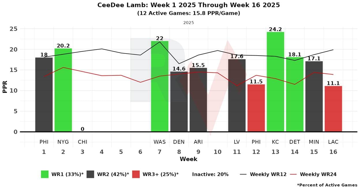 Lamb had an ankle sprain that cost him time; he has played in 11 games, finishing as a WR1 four times. He has not had a single-digit performance other than in Week 3, which he exited early (although he was already having a bad game).