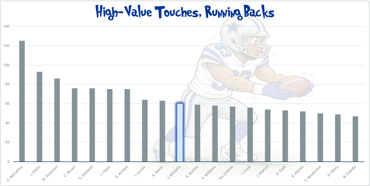 Williams hasn’t had an invisible passing game involvement, but it is certainly nothing to write home about. He has a very healthy goal line usage, however, and the Cowboys have a lot of volume, so he still ranks in the top 10 in high-value touches (HVTs), which is the sum of green zone carries and receptions, where fantasy points are often scored.