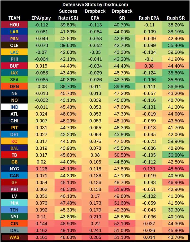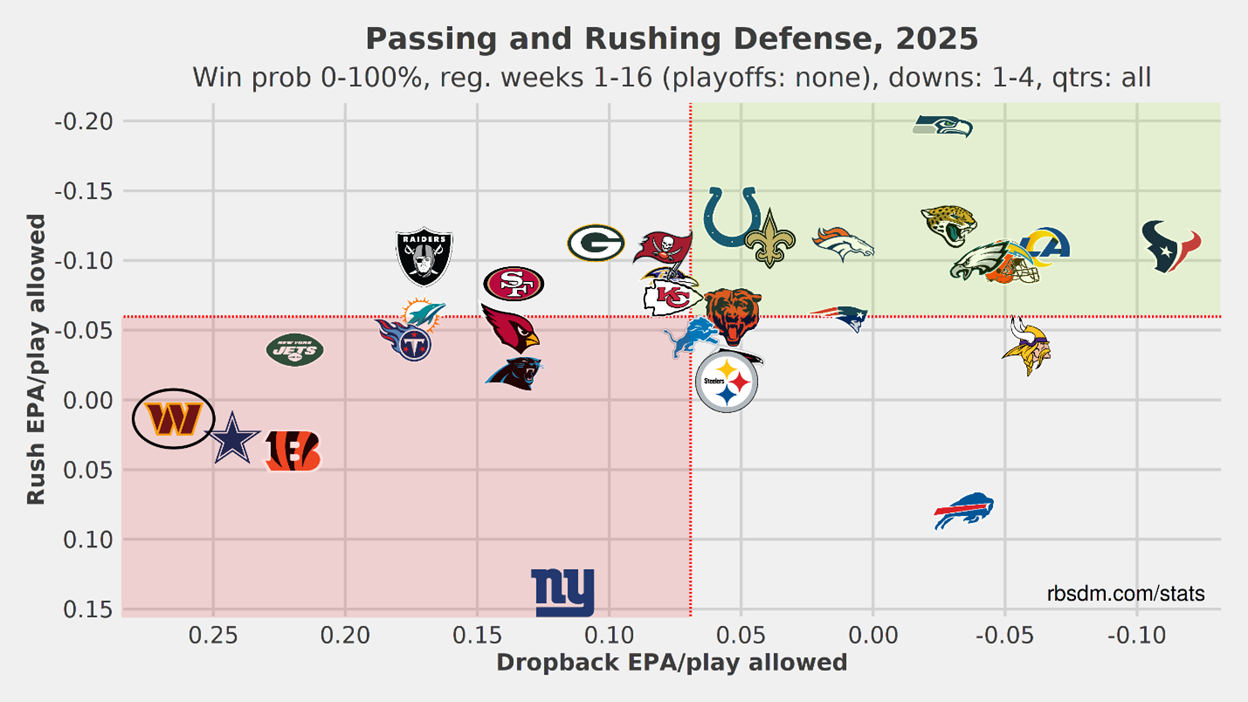 The Commanders’ defense is the worst in the league in dropback EPA allowed and below average in rush EPA allowed.