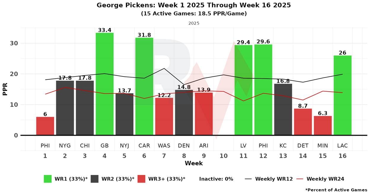 Pickens has exhibited a higher single-game upside (which we like), having hit between 25 and 35 PPR points five times. The inverse, of course, is that he’s been slightly more vulnerable to downside, but we’ll take it. The amount he outpaces the field at his highs is more significant than the amount he trails at his lows, so he’s a good bet.