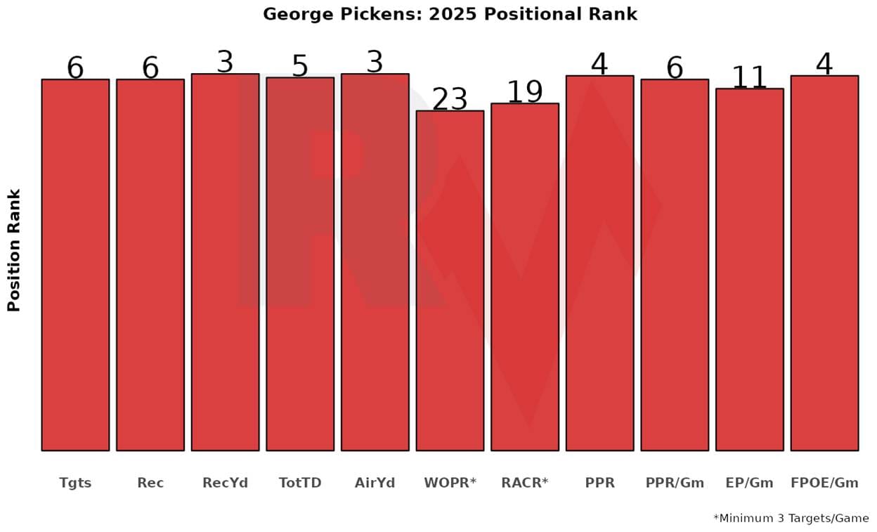 Pickens looks better in the overall counting stats because he has played the whole season without any absences. Pickens still ranks fourth in PPR points among WRs, ranking at or near the top five in several statistical categories.