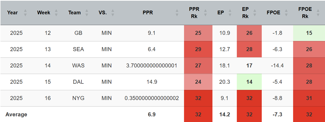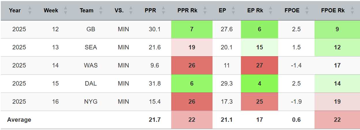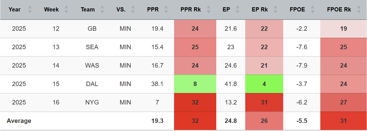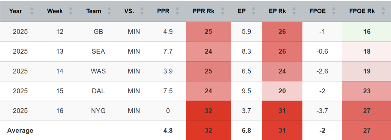 The Vikings, however, are a real problem for QBs. Not only do they hold opposing QBs to the words PPR rank in the last five games, but they also hold them to last place in expected points (EP) and fantasy points over expected (FPOE). It is very unusual to see a clean sweep like this, and I’ll stress that the Vikings have seen Jordan Love, Sam Darnold, and Dak Prescott within that sample—three of the most efficient passers in the league.